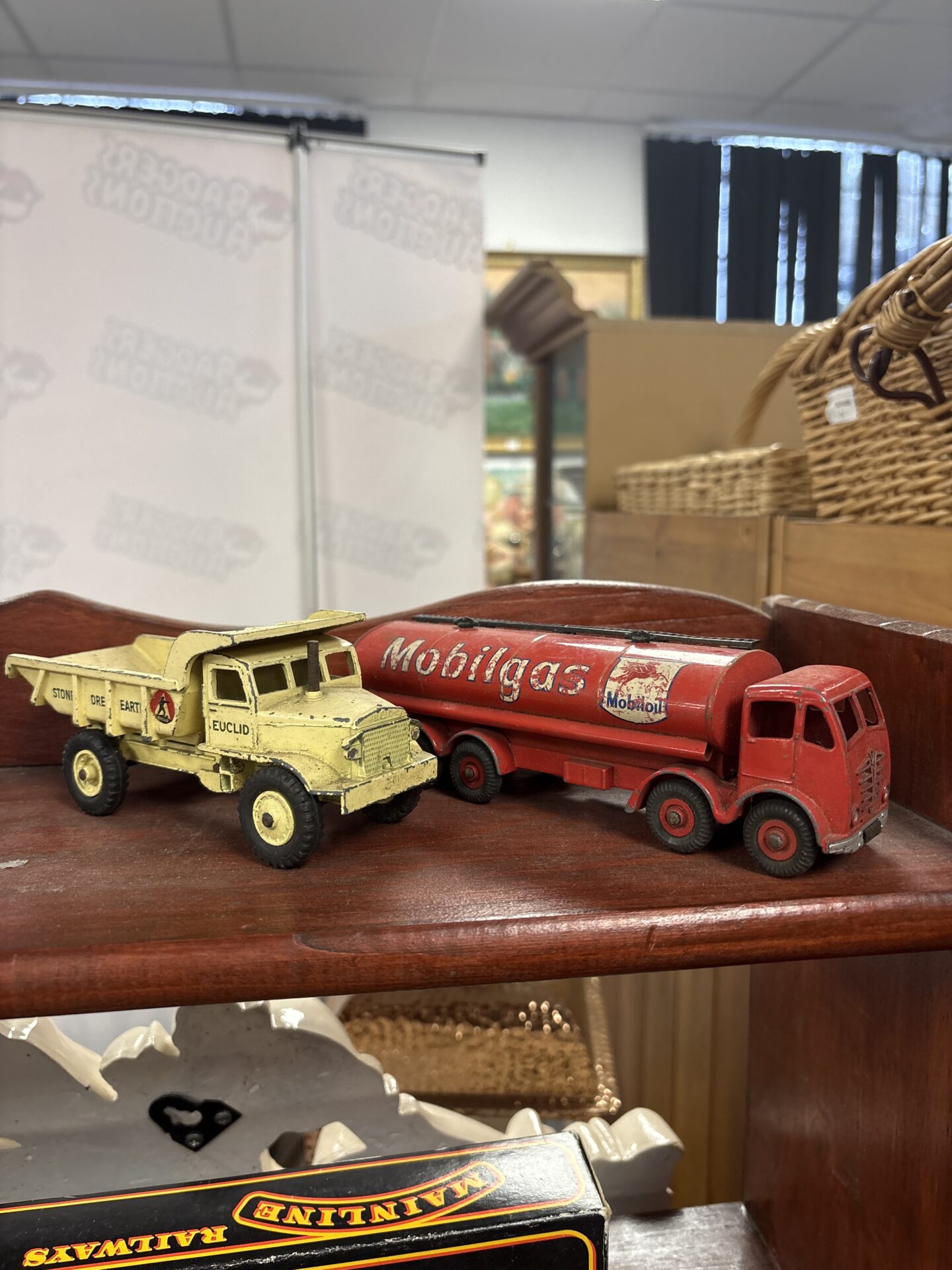 This vintage Dinky Supertoys diecast truck features a red cab and Mobilgas branded trailer. A classic collectible, this truck showcases the robust construction and detail Dinky Supertoys were known for. Perfect for collectors of vintage toys and diecast vehicles, this piece offers a nostalgic glimpse into mid-century toy manufacturing.