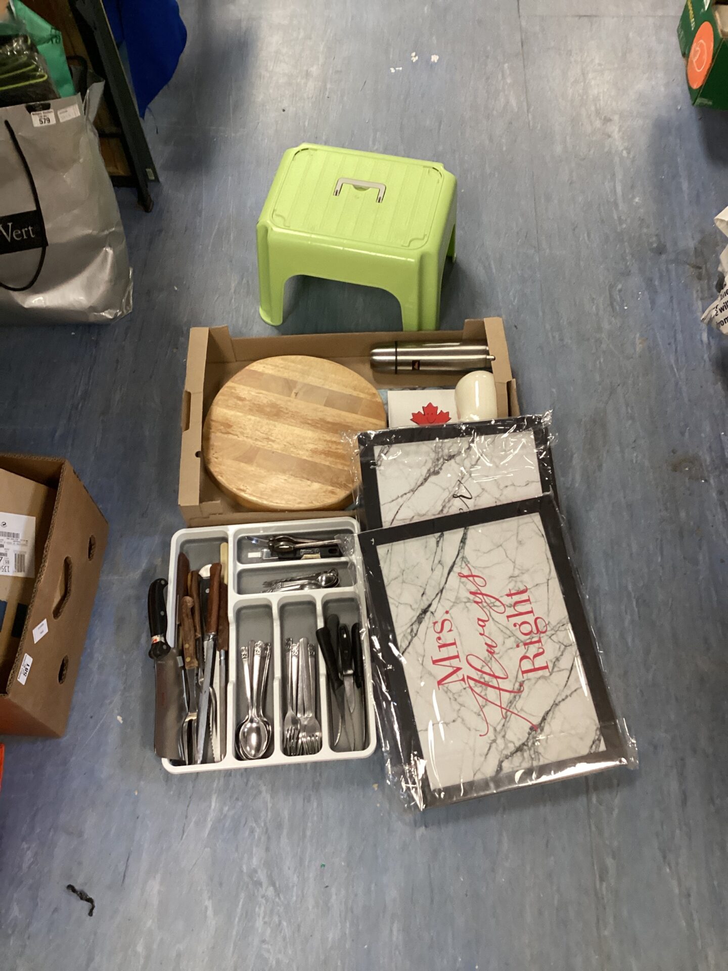 This lot comprises a collection of kitchen and dining items, including a plastic serving tray, assorted cutlery pieces, and a small plastic stool. The tray appears to be designed for serving meals or drinks, while the cutlery set offers a variety of utensils for everyday dining. The inclusion of a plastic stool adds a functional element to the lot, suitable for extra seating or as a step stool.