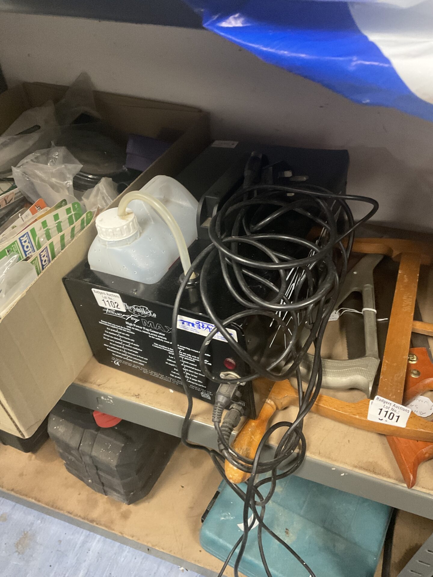 The smoke machine is presented in used condition, with signs of previous use and wear. It is offered for sale as viewed, and its operational status is unknown. This item may appeal to collectors of vintage party equipment, stage lighting enthusiasts, or those seeking a project to restore a classic disco accessory.