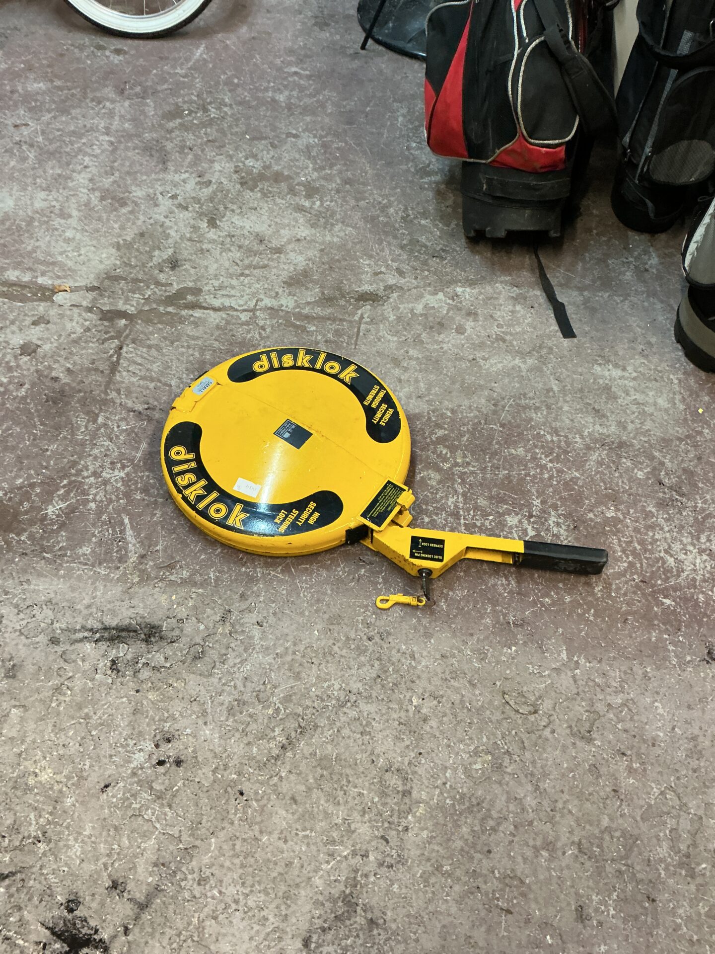 This is a Disklok steering lock, a highly visible and robust vehicle security device. Designed to deter theft by physically locking onto the steering wheel, it’s a well-regarded system known for its effectiveness and distinctive appearance. The bright yellow colour and substantial construction are intended to act as a strong visual deterrent to potential thieves.