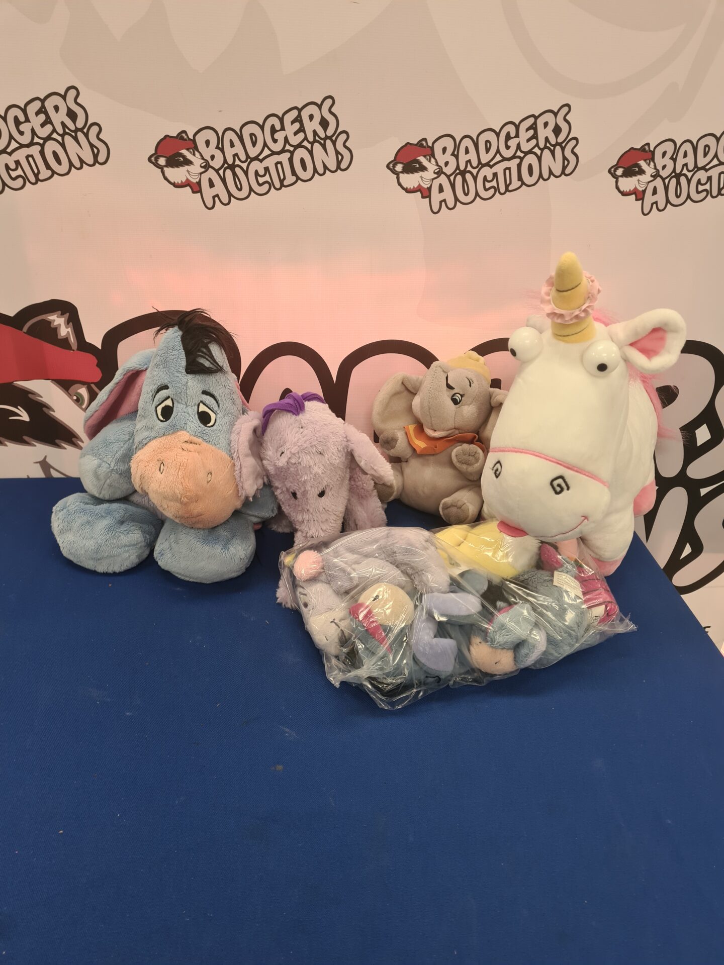 This lot comprises a selection of soft toys featuring popular characters from Disney and Illumination’s *Despicable Me 3*. The collection includes a large plush Eeyore, known for his melancholic charm, alongside character plushies from the *Despicable Me* franchise. These toys are designed for cuddling and imaginative play, appealing to fans of all ages.