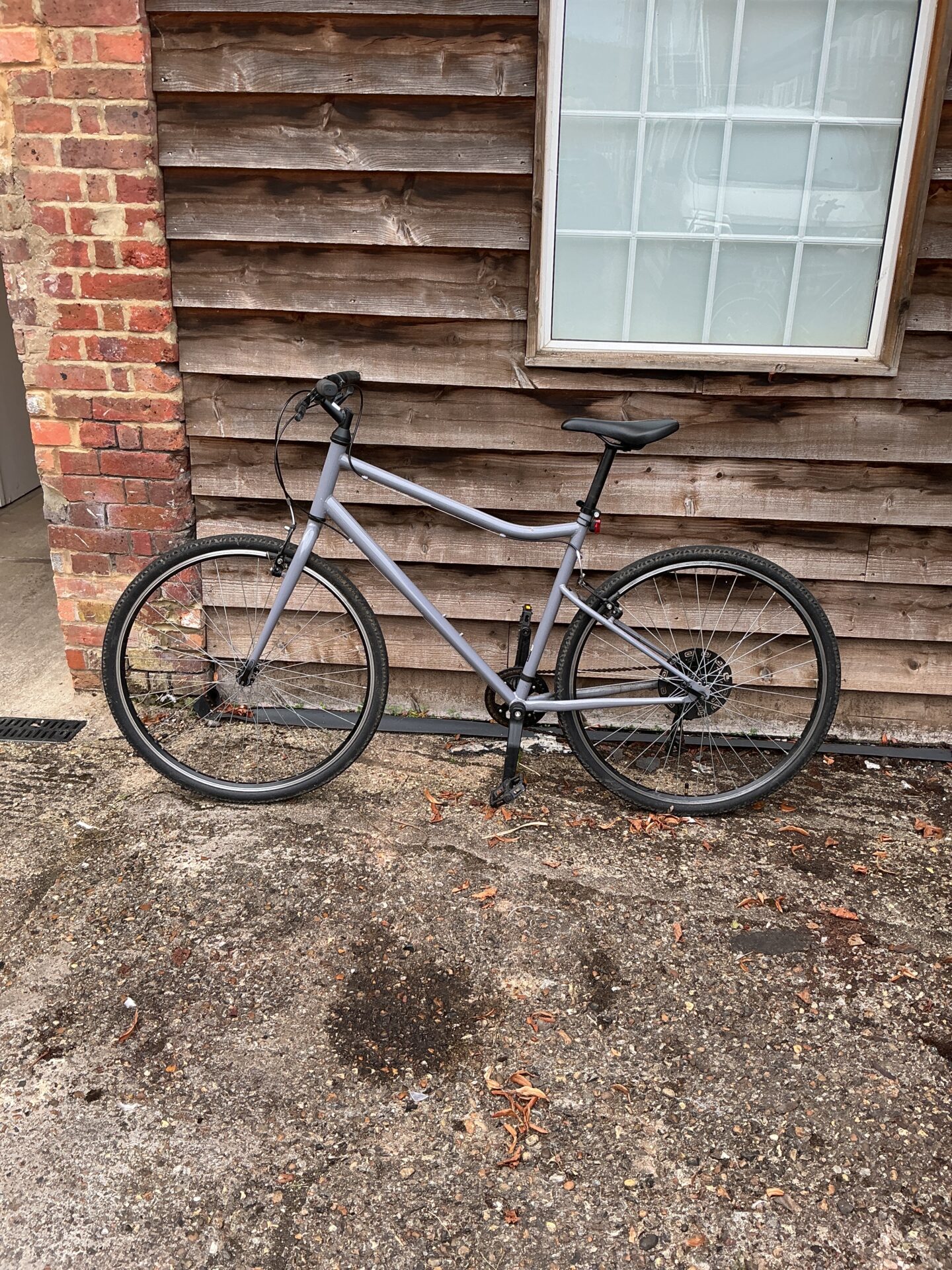 This is a DK bike, a versatile hybrid designed for comfortable commuting and leisurely city riding. Featuring a lightweight alloy frame and a comfortable saddle, this bike is built for efficiency and enjoyment. It boasts reliable components and a smooth-shifting drivetrain, making it ideal for navigating urban environments or enjoying bike paths.