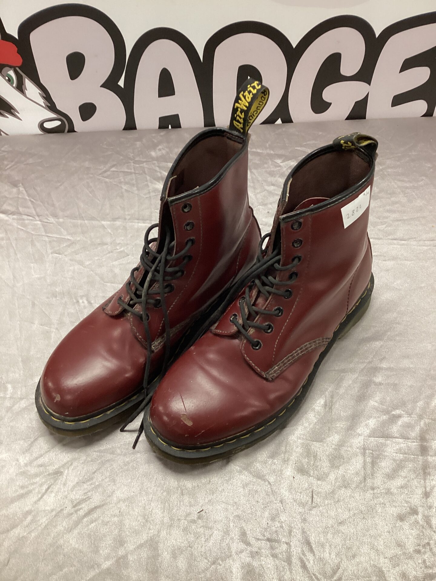 These boots show signs of wear consistent with age and previous use, adding to their character and vintage appeal. They present a desirable patina and are likely to appeal to collectors of vintage footwear or those seeking a well-worn, authentic pair of Dr Martens. The boots are a size 10 and would make a statement addition to any wardrobe.