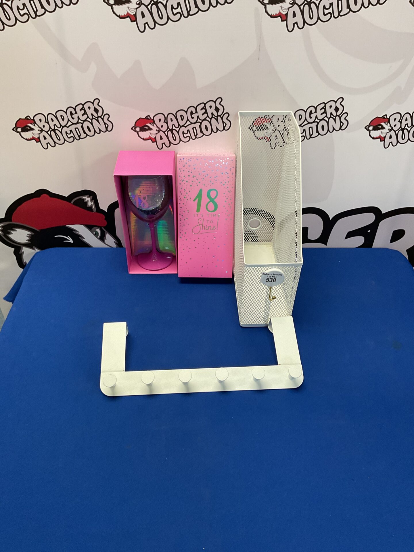 This lot includes a white mesh document holder designed for desk organisation, alongside a glass piece featuring the motivational phrase “It’s Time to Shine”. The glass is presented in its original packaging. Also included is an Ikea door hanging clothes hanger, offering additional storage solutions.