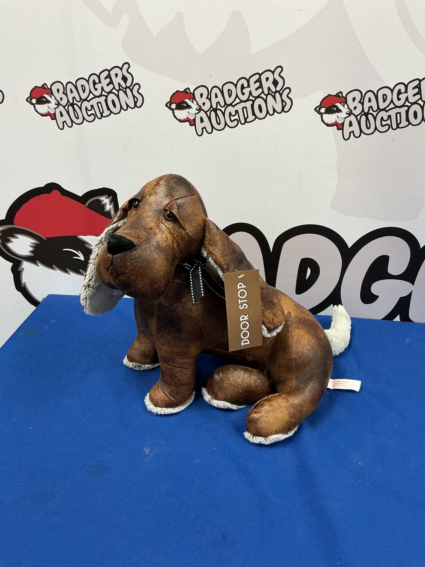 This is a charming cast iron dog door stop, manufactured by Lesser and Pavey. The design features a realistically sculpted canine figure, intended to hold doors open. This particular doorstop is a classic example of functional home decor, popular for its aesthetic appeal and practical use.