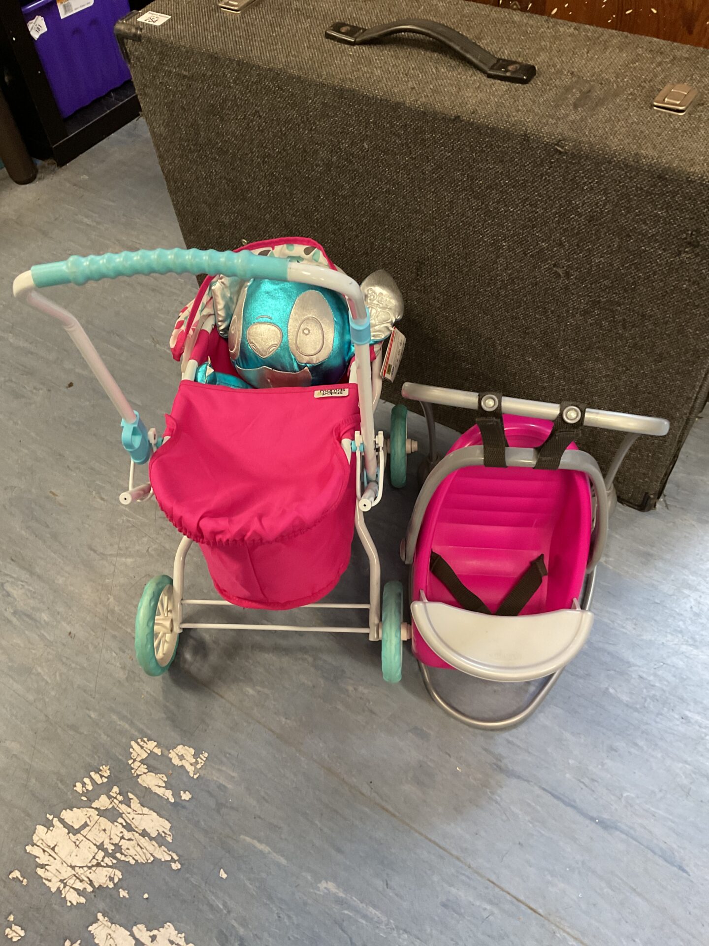 This is a Mamas Papas dolls pram, designed for imaginative play. The pram features a classic style with a pink fabric interior and a silver-coloured frame. It includes a baby rocker chair, allowing for extended play scenarios. This set provides a charming addition to any child’s toy collection, encouraging nurturing and role-playing.