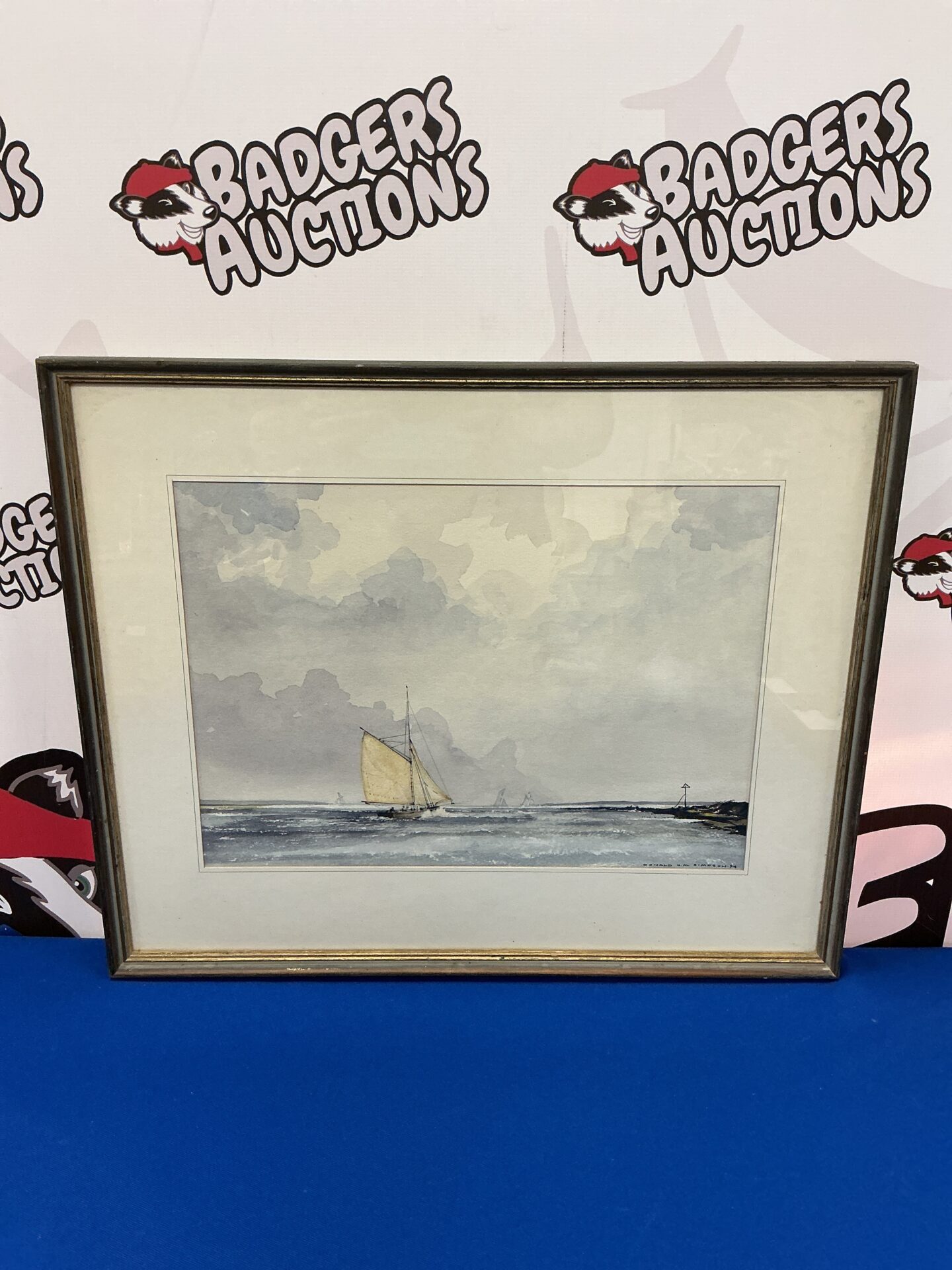 This is a watercolour painting by Donald H M Simpson, titled “A Thanet Shrimper”. The artwork depicts a traditional shrimping boat sailing on the water, rendered in a delicate and atmospheric style. Simpson’s work often captures the essence of coastal life and the beauty of the sea, and this piece is a fine example of his skill in capturing light and movement on water.