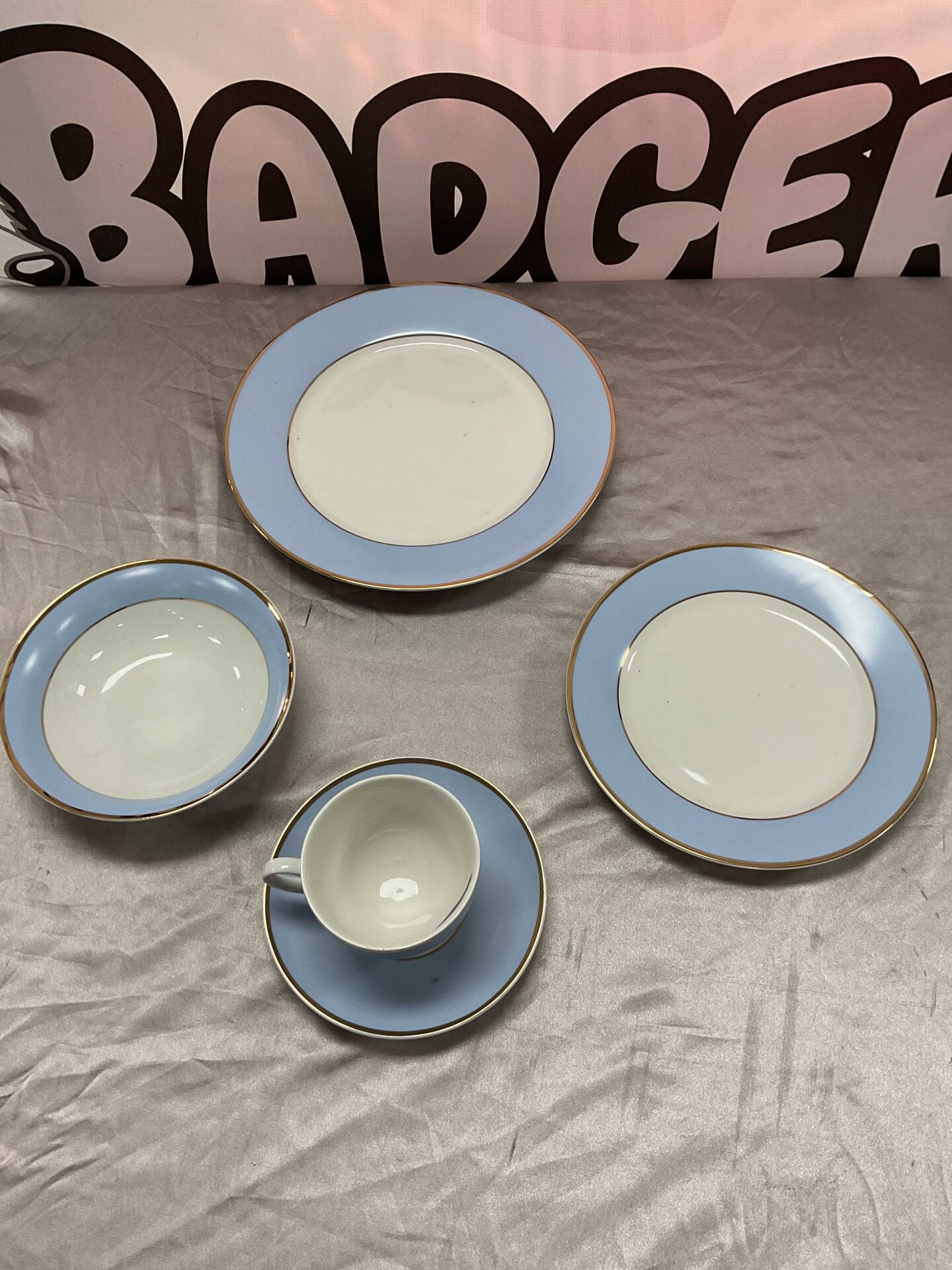 This is a Doulton dinner set, featuring a delicate cream-coloured base with a light blue band and gold trim. The set includes a selection of plates and cups, showcasing a classic and elegant design typical of Doulton’s renowned porcelain craftsmanship. The pattern and colour scheme suggest a refined aesthetic, suitable for both everyday use and special occasions.