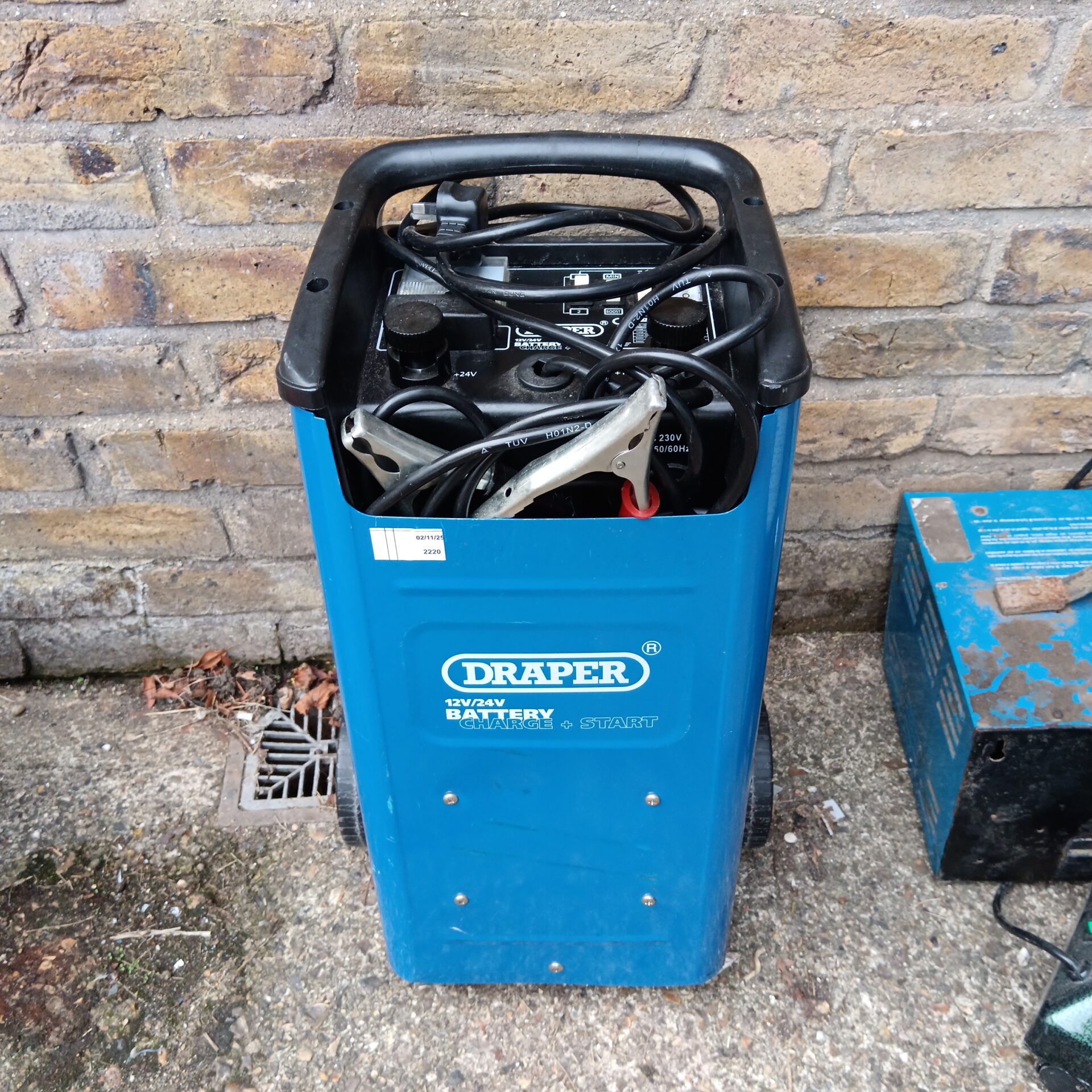 This is a Draper 12v and 24v battery charger, designed for automotive use. It features a robust construction typical of Draper tools, and is intended to both charge and jump-start vehicle batteries. The unit appears to have leads for connection to the battery terminals, and is designed for use with both 12-volt and 24-volt systems.