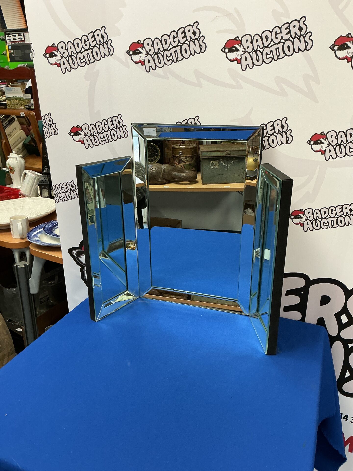 This vintage tri-fold dressing table mirror is a beautiful and functional addition to any bedroom or vanity. Its adjustable design and classic style make it perfect for makeup application, hair styling, or simply checking your appearance. A charming piece for collectors or anyone looking to add a touch of vintage elegance to their home.