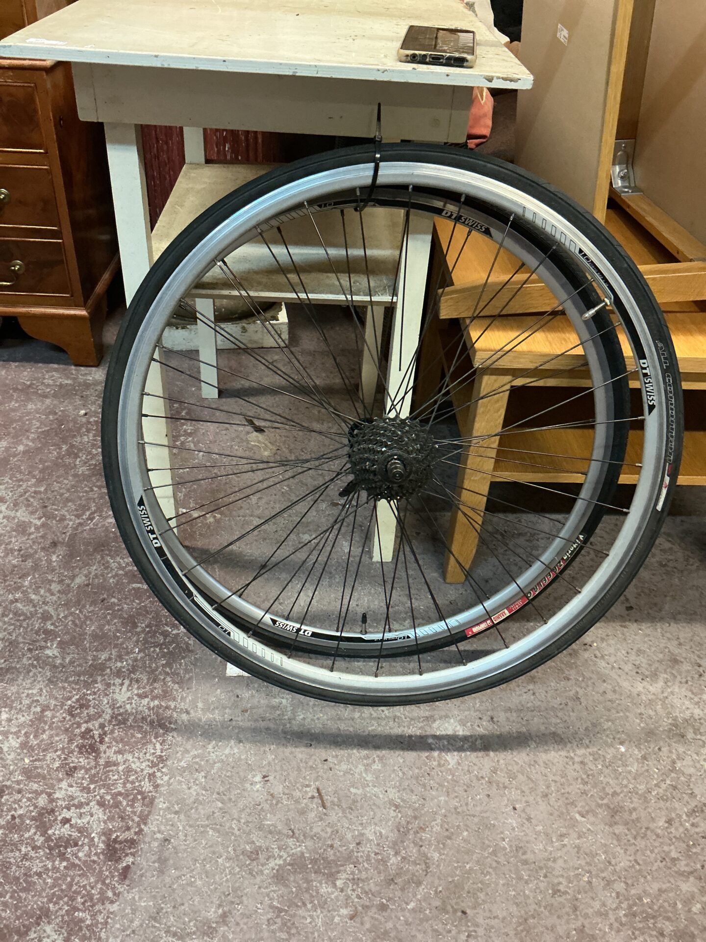 This listing features a pair of DT Swiss bicycle wheels. These wheels appear to be designed for road biking, featuring a classic spoke pattern and a durable construction. The wheels are fitted with tyres, suggesting they are ready to be fitted to a bicycle.