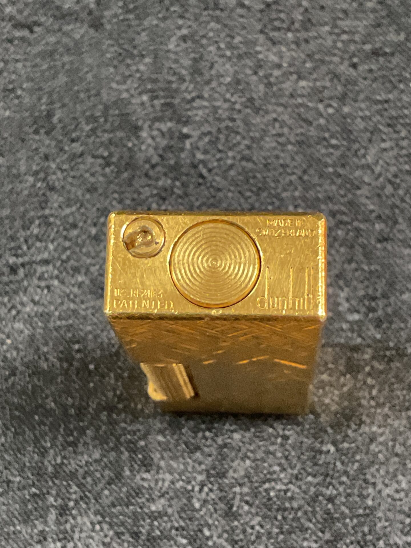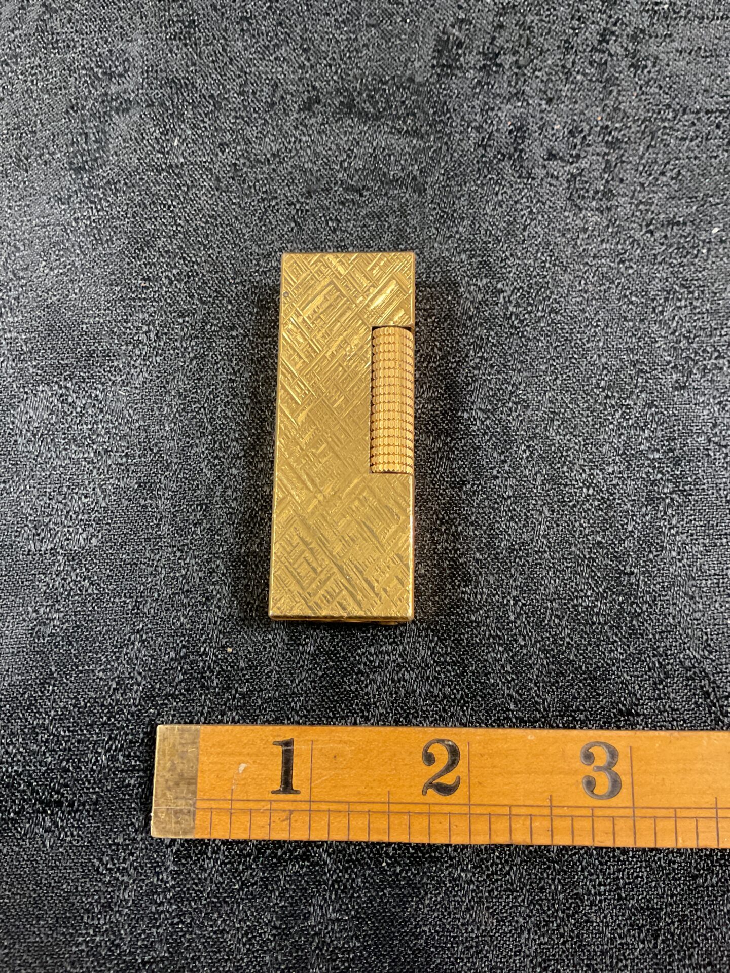 This is a vintage Dunhill lighter, notable for its striking gold-plated finish and textured design. The lighter features a unique pattern across its surface, adding to its aesthetic appeal. It is a classic example of Dunhill’s commitment to quality and style, designed for discerning individuals.