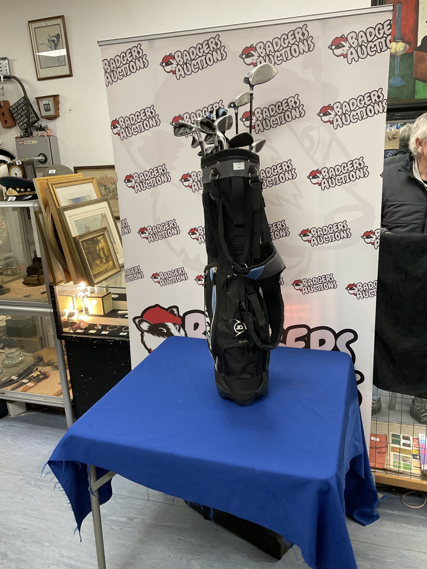 This lot features a Dunlop golf club set, complete with a golf bag. The set appears to be a classic, vintage style, likely dating from mid-20th century. The clubs show a traditional design, indicative of the era, and the bag is constructed from a durable material, suggesting it was built to withstand regular use on the course.