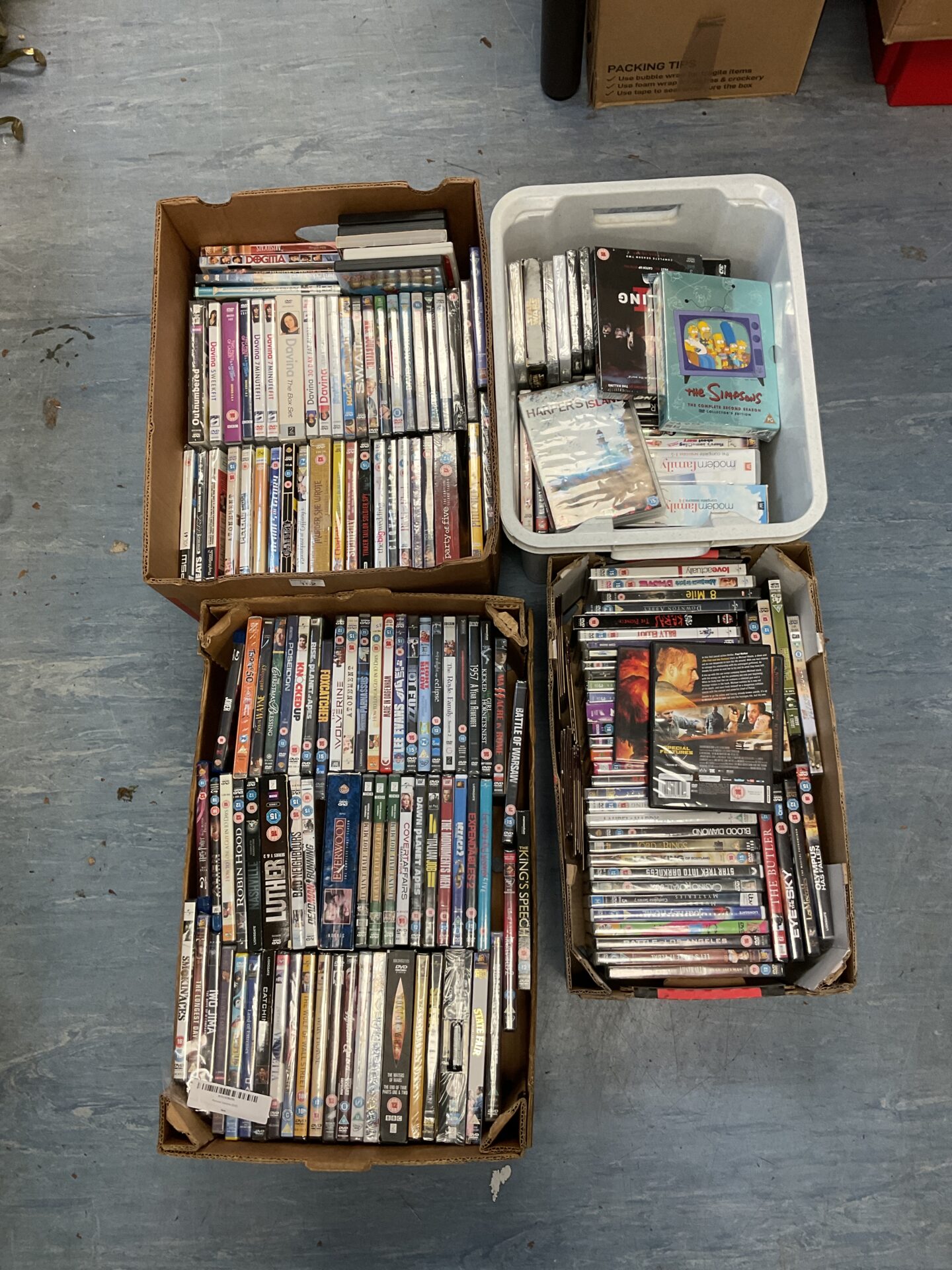 This lot comprises four boxes filled with a diverse collection of DVDs. The collection appears to span various genres, including drama, comedy, action, and potentially family films. The DVDs are housed within their standard plastic cases, offering a substantial amount of home entertainment options for film enthusiasts.