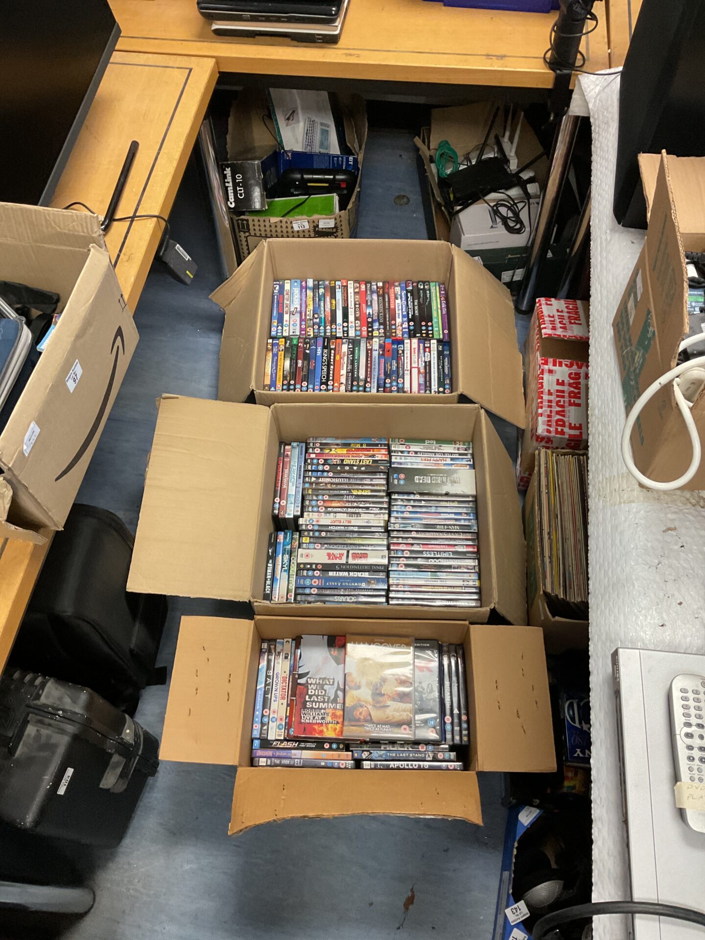 This lot comprises three boxes filled with a large mixed collection of DVDs. The collection appears to span various genres, including action, comedy, drama, and potentially more, offering a diverse range of cinematic experiences. The quantity suggests a substantial library for film enthusiasts or those looking to build a home entertainment system.
