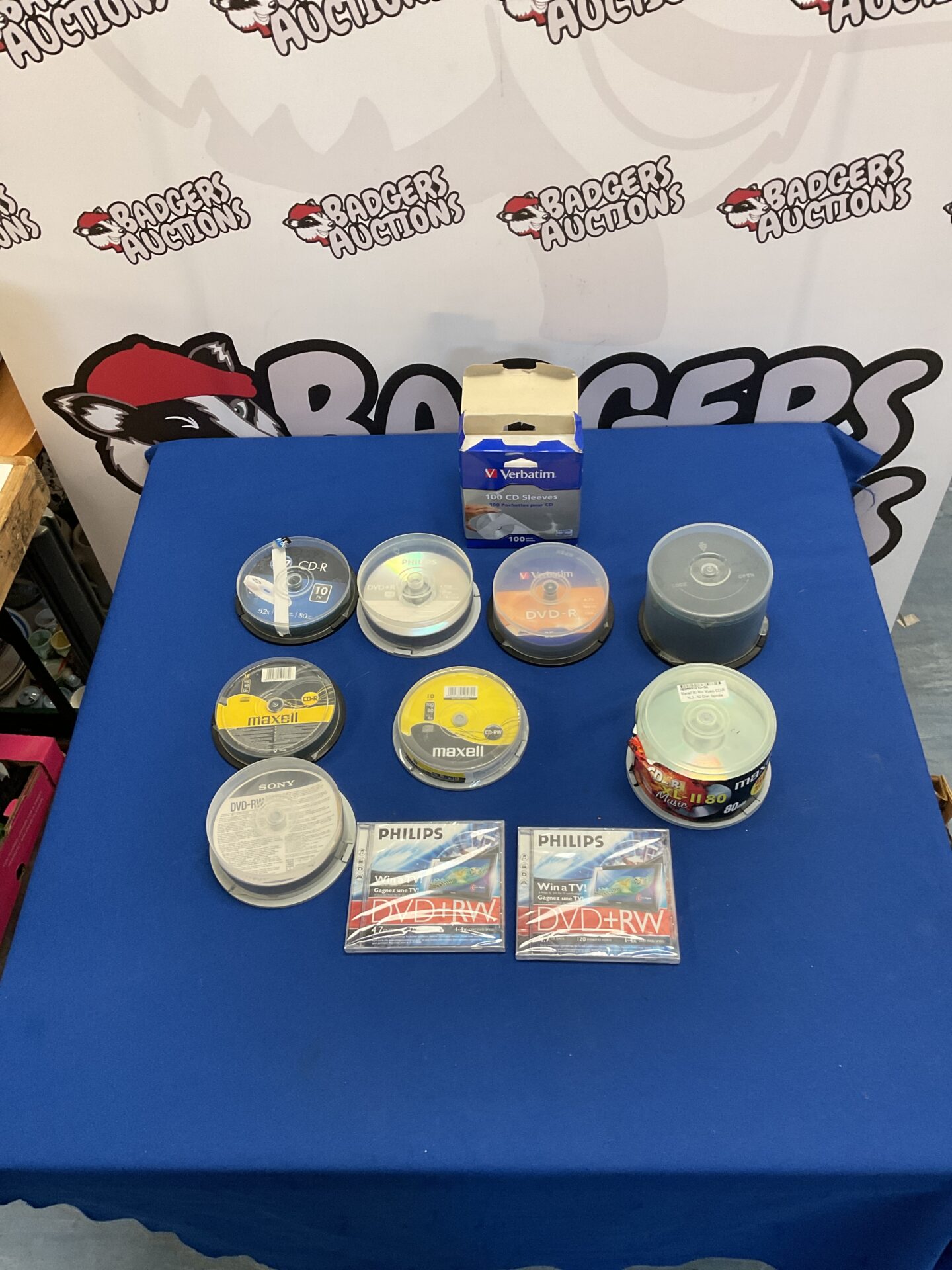 This lot comprises a collection of blank recordable discs, including both DVD-R and CD-R formats. These discs were commonly used for data backup, software distribution, and creating custom audio or video compilations. The lot appears to contain a variety of brands and potentially different storage capacities within the collection of discs.