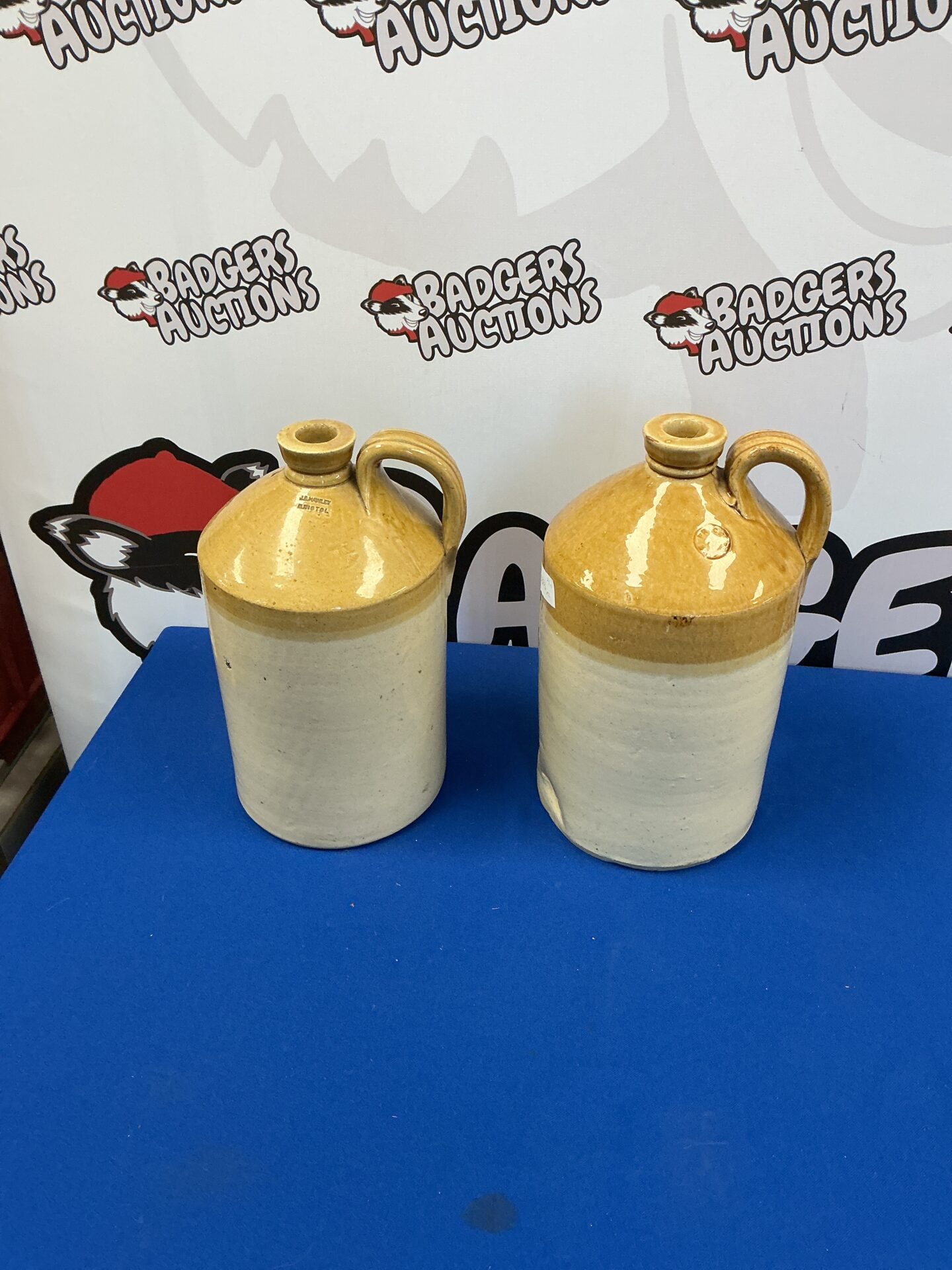 These flagons show signs of age and use, with some surface wear and minor imperfections consistent with their vintage. These characteristics add to their authenticity and appeal to collectors of antique kitchenalia and rustic decor. They would make a unique addition to a display or a charming functional piece for a vintage-inspired kitchen.