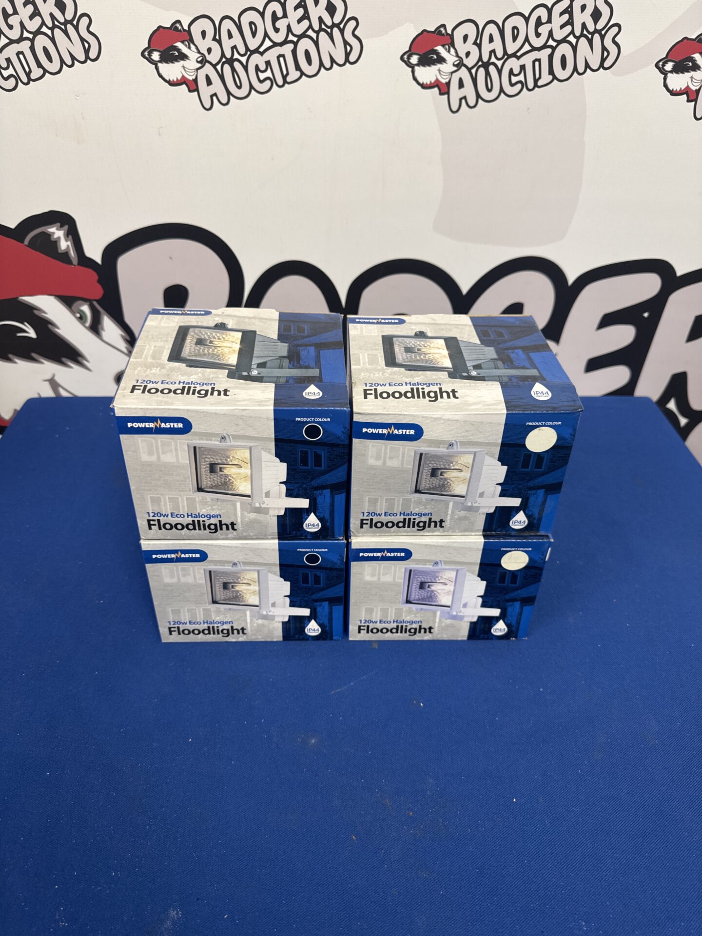 These are four Powermaster IP44 rated 120w eco halogen floodlights, designed to provide powerful illumination for gardens, driveways, or security purposes. The IP44 rating ensures they are splash-proof and suitable for outdoor use, while the halogen bulbs offer a bright, white light. These floodlights are ideal for enhancing visibility and safety around your property.