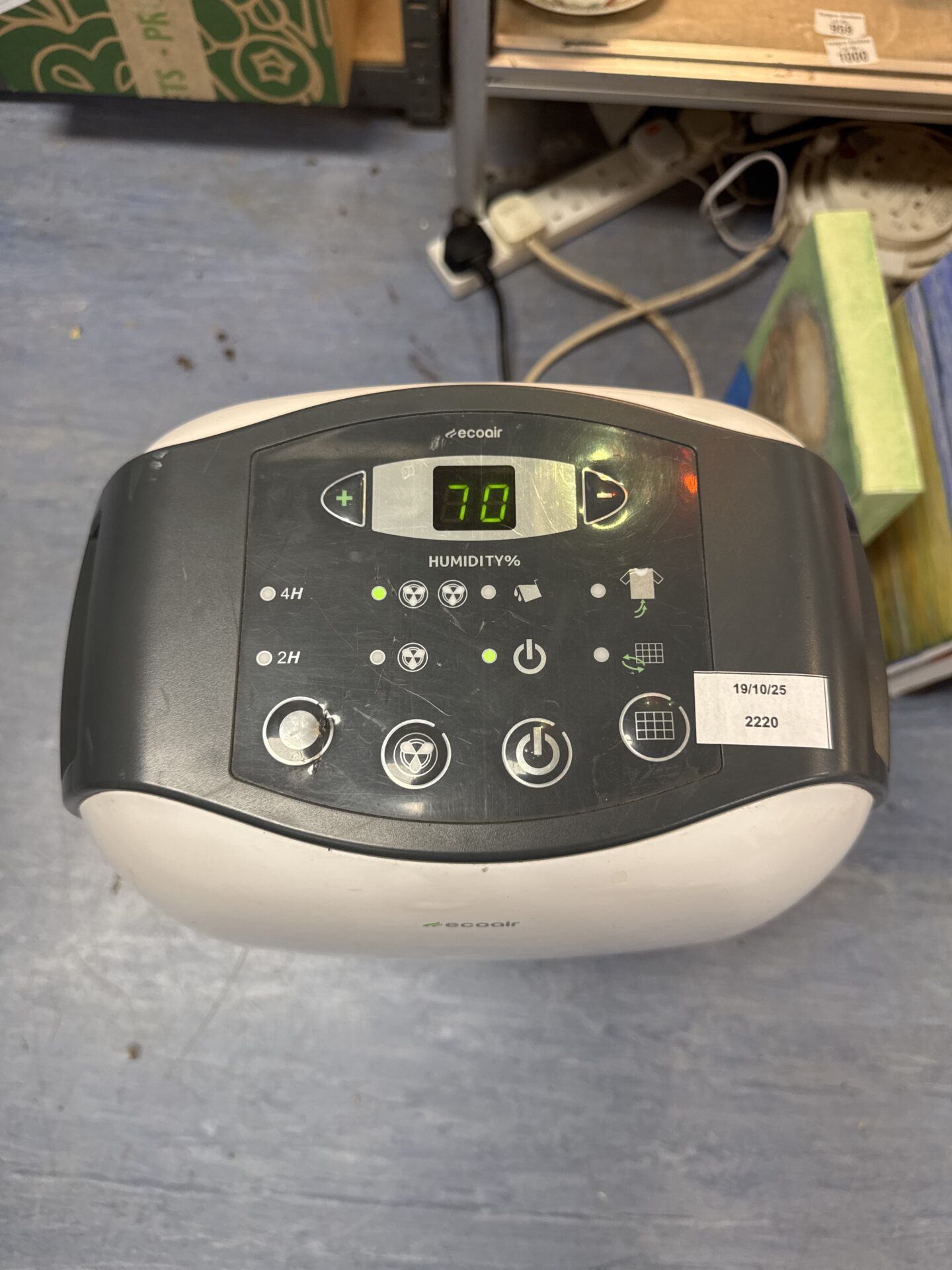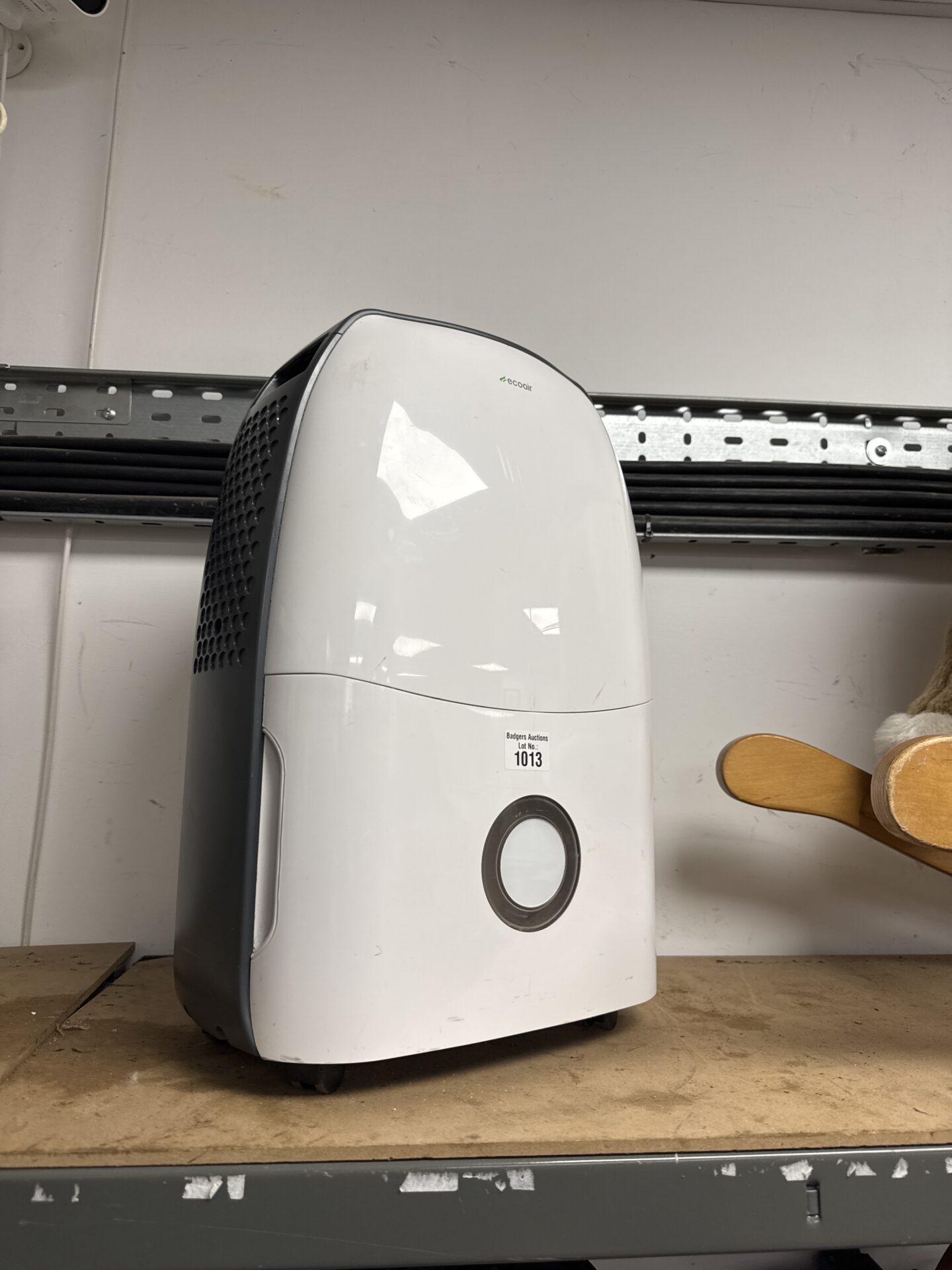 This is an Ecoair portable dehumidifier unit, designed to remove excess moisture from the air. The unit is white and features a sleek, modern design. Model number 1013 is visible on the front panel. It’s a convenient solution for damp rooms, basements, or any space needing humidity control.