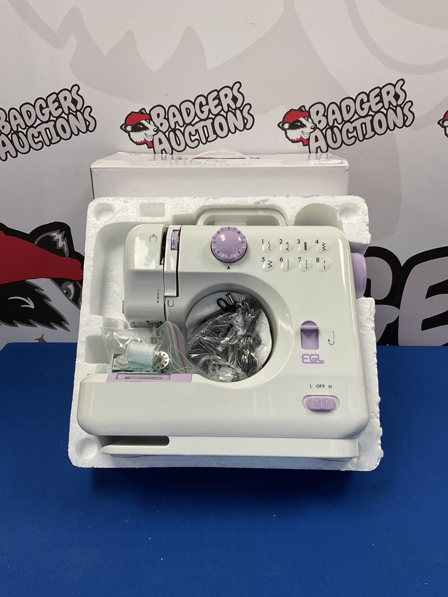 This is an EGL electric sewing machine, a compact and portable device designed for basic sewing tasks. The machine features a white plastic casing and appears to be a classic example of mid-century home sewing technology. It’s a straightforward, user-friendly model intended for simple repairs and crafting projects.