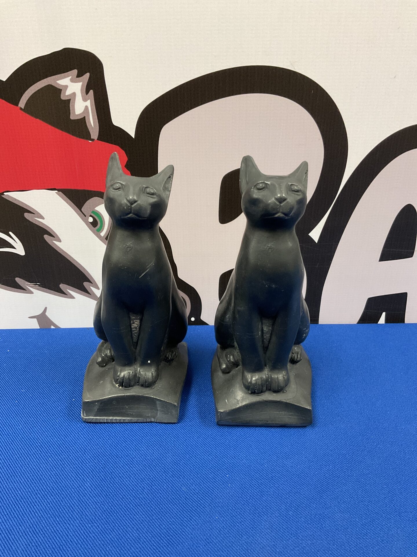 This pair of statues depict stylized cats, likely inspired by the ancient Egyptian goddess Bastet, protector of the home and fertility. Crafted from a dense stone material, these figures exhibit a sleek, upright posture with detailed facial features and a regal bearing. The statues stand on rectangular bases, adding to their stability and display potential. Their dark colour and smooth finish suggest a polished surface, enhancing their aesthetic appeal.