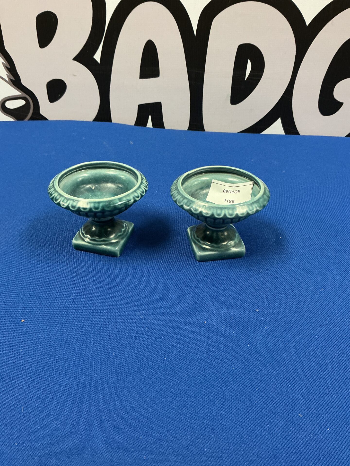 These are a pair of striking mid-century modern candle holders designed by Elaine Goddard. Crafted from pottery, these holders feature a distinctive, organic form with a textured surface and a vibrant green glaze. The design embodies the aesthetic of the 1960s studio pottery movement, showcasing Goddard’s skill in shaping and glazing ceramics.