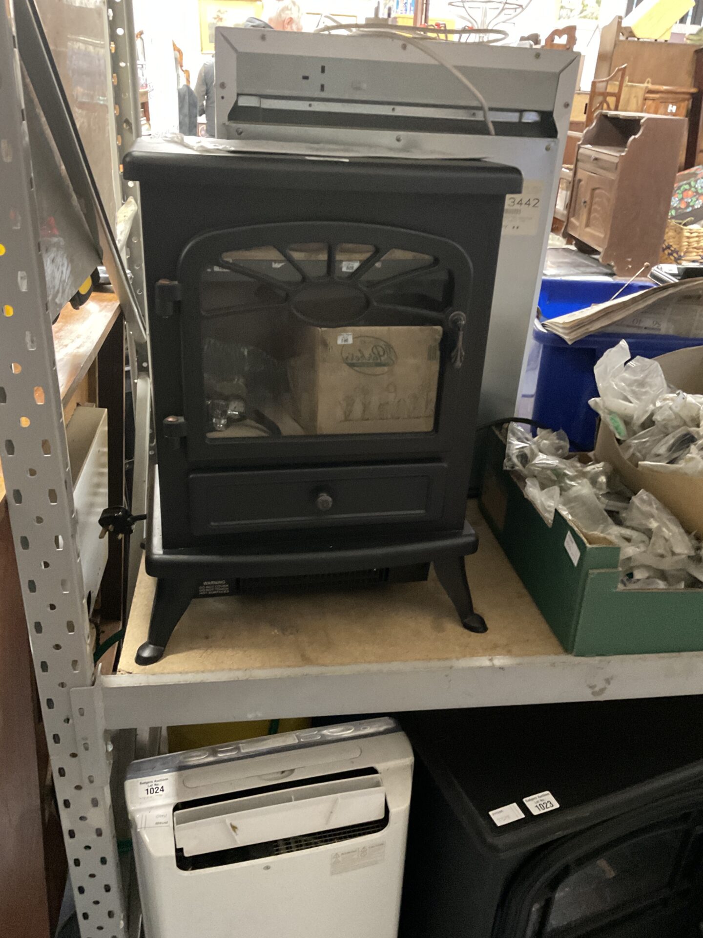 This Focal Point electric fireplace offers a charming vintage aesthetic and supplemental heat for your home. Featuring a classic stove design with a black finish, it’s perfect for adding ambiance to any living space. This unit shows signs of use and may require a replacement bulb.