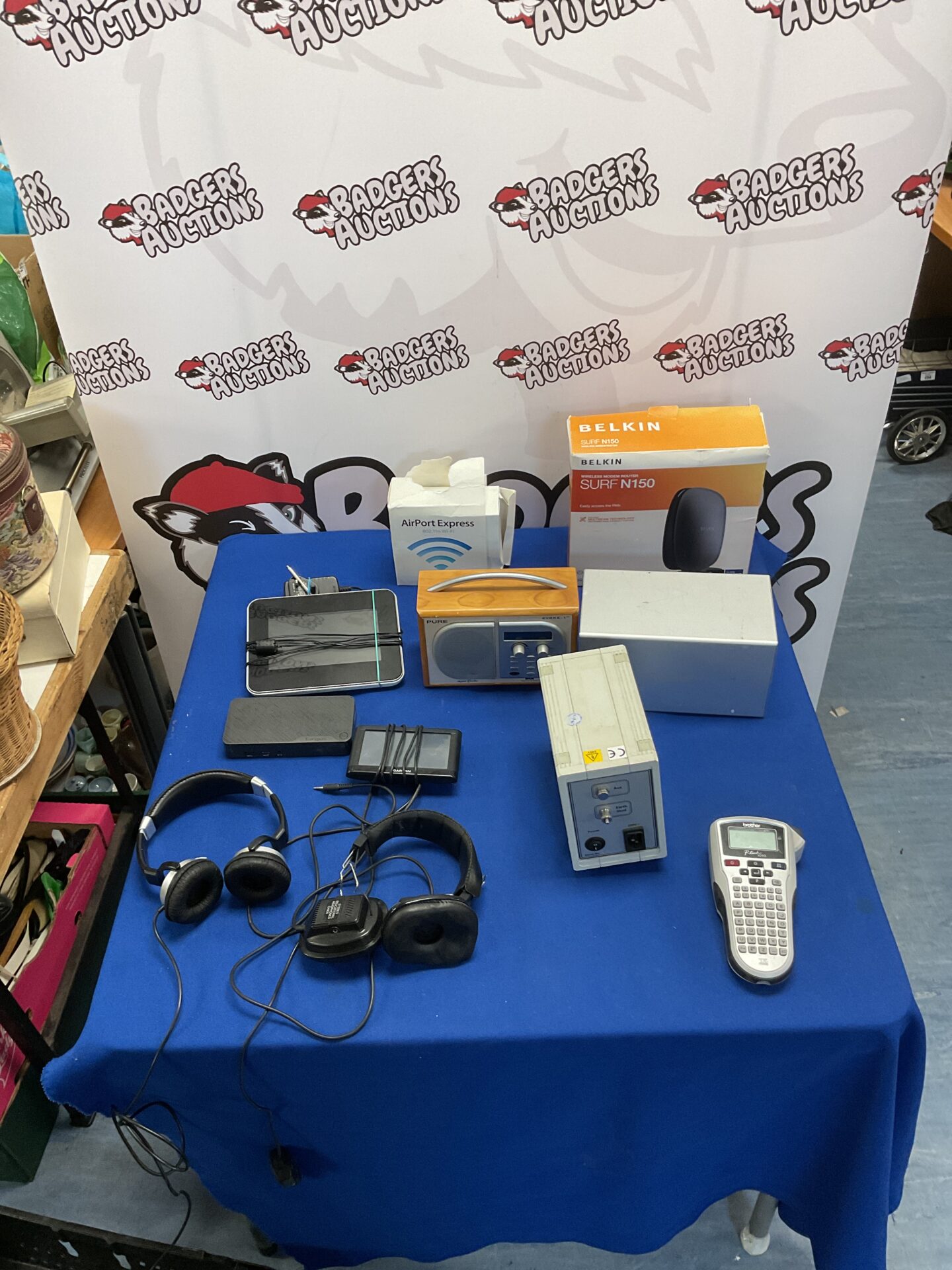 The condition of these electronics appears consistent with age and use. While functionality is not assessed, this lot presents an opportunity for enthusiasts or collectors of vintage and modern electronics. The combination of a radio, router, and photo frame offers a diverse range of items for display or potential restoration.