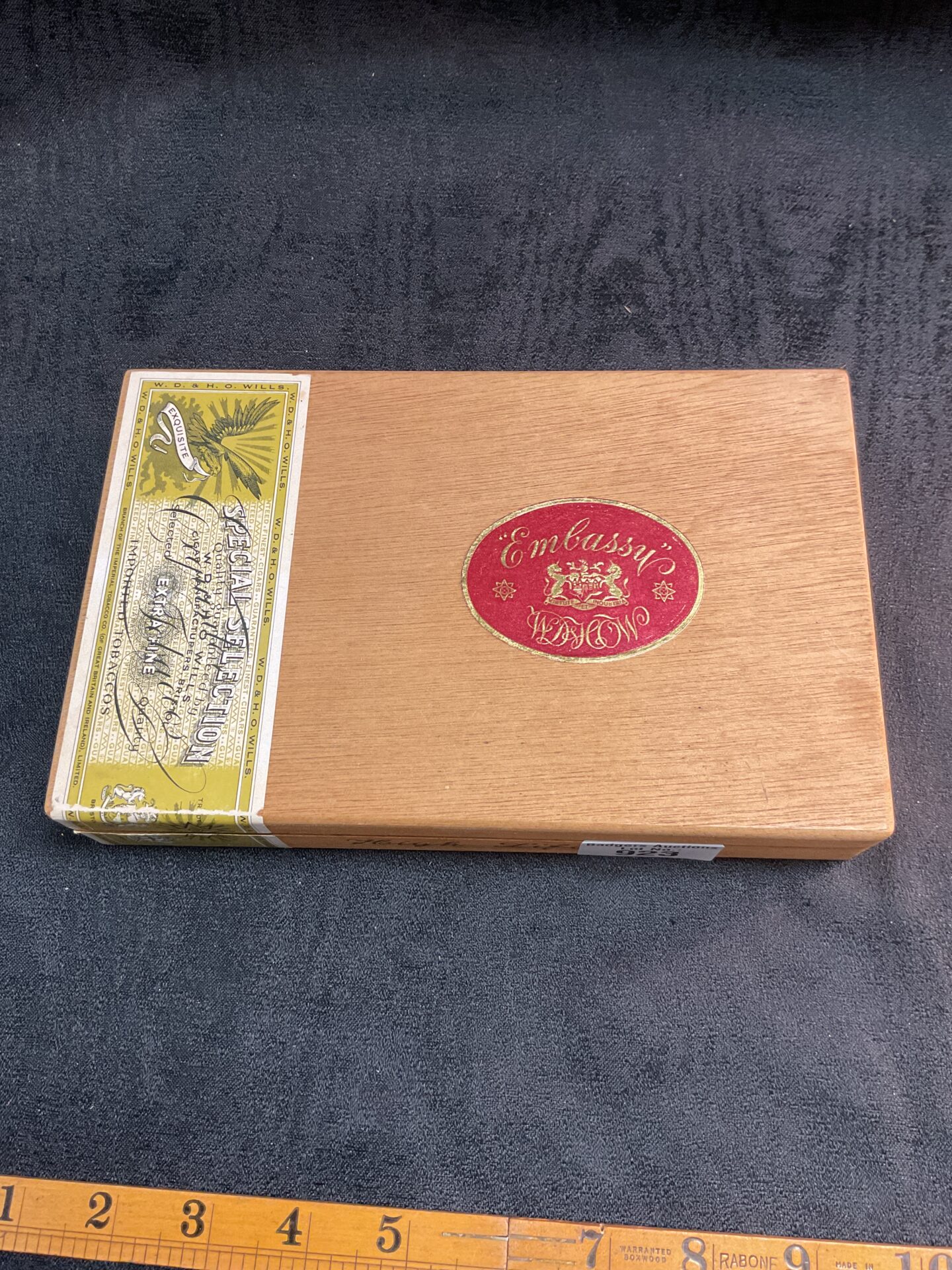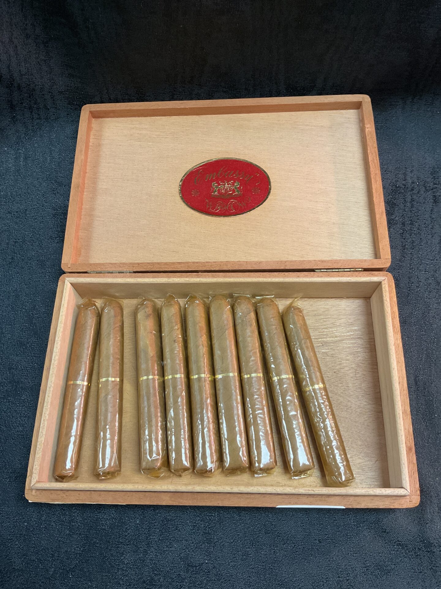 This is a wooden box containing nine Embassy cigars. The box is constructed from light-toned wood and features a decorative label on the lid. The cigars within are individually cellophane-wrapped, preserving their condition and aroma. This box represents a classic presentation of premium cigars, likely intended for enjoyment or as a collectible item.