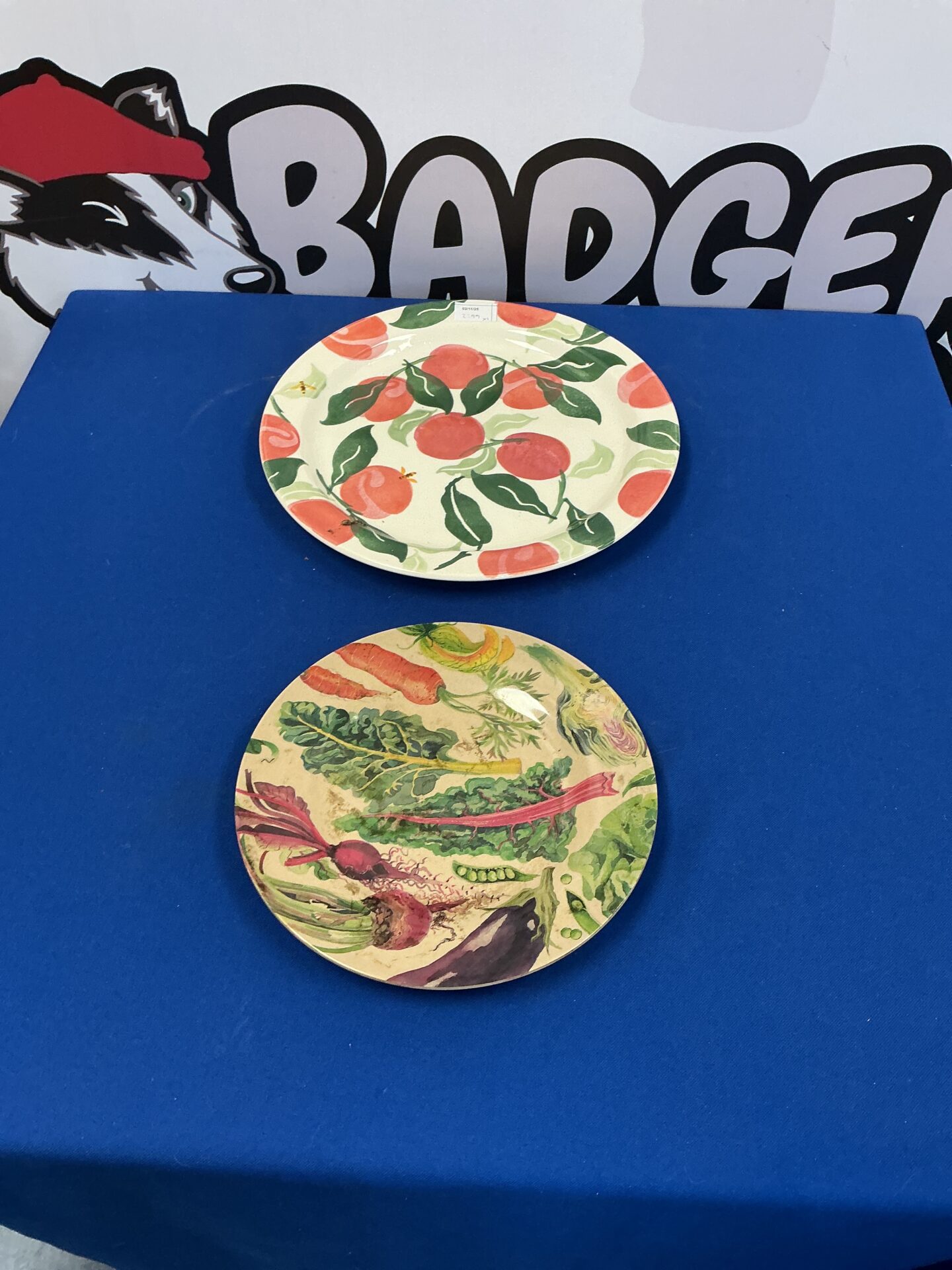 Both plates appear to be in good condition, with no immediately visible cracks or chips. As collectable kitchenware, these plates would appeal to enthusiasts of the Emma Bridgewater brand and those seeking charming, patterned ceramics. Their bright design and quality craftsmanship make them a desirable addition to any collection or home.