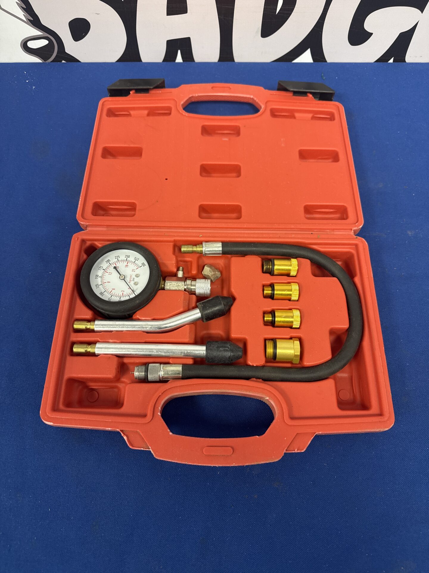 This kit appears to be in good used condition, with all major components present. While there may be minor cosmetic wear consistent with use, the gauge and adaptors are functional and ready to use. This kit would be a useful addition to any workshop or tool collection, offering a cost-effective way to perform essential engine diagnostics.