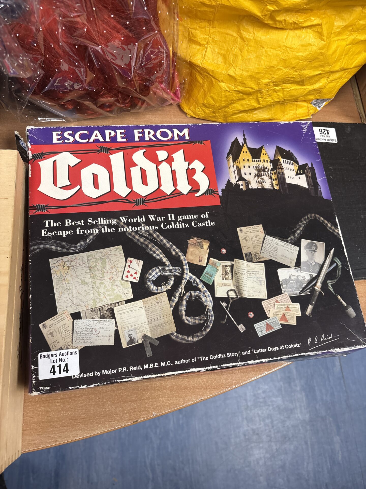 This is a vintage copy of the Escape From Colditz board game. A classic strategy game themed around the infamous prisoner-of-war camp, it challenges players to successfully escape as Allied prisoners. The game involves planning routes, overcoming obstacles, and utilising various escape methods, all while evading the German guards.