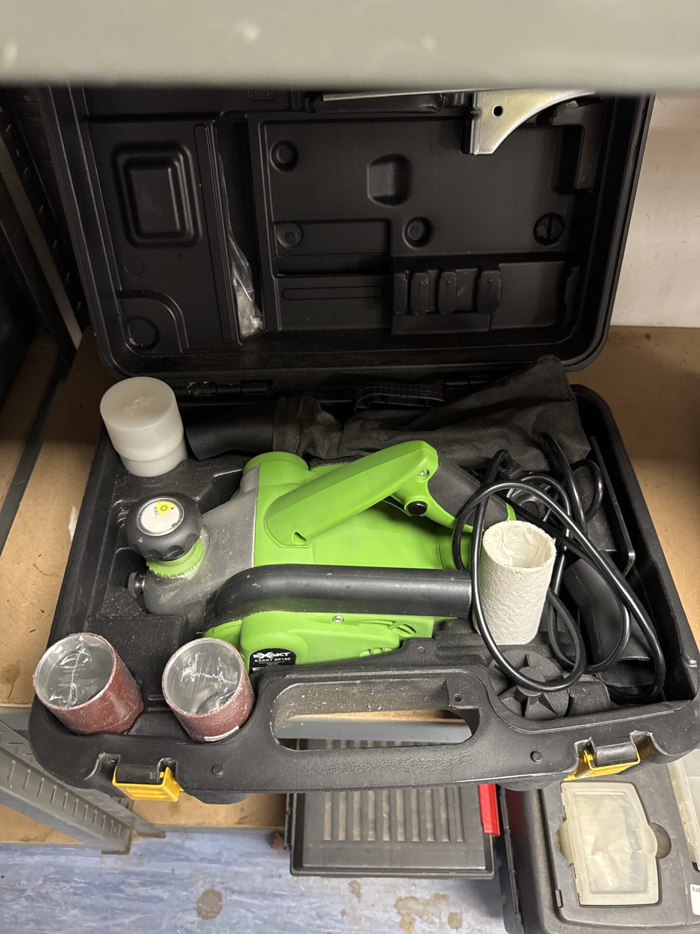 This is an Exakt sp180 planer sander, a handheld power tool designed for shaping and smoothing wood surfaces. The sander features a robust construction and is presented within its original moulded carrying case, offering protection and portability. The case has internal compartments for accessories, though the contents are not visible.