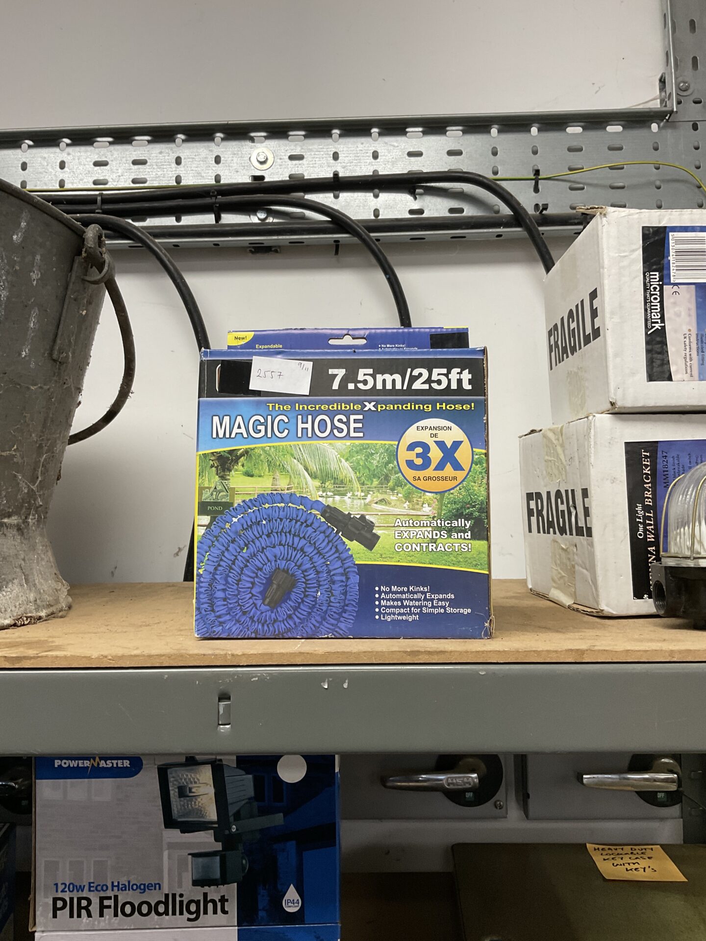 The hose is presented as-found, with visible wear and tear consistent with use. While its functionality is not confirmed, it may appeal to collectors of garden tools or those seeking a project to restore a vintage item. The hose’s unique expanding design and potential for restoration make it an interesting piece for enthusiasts.