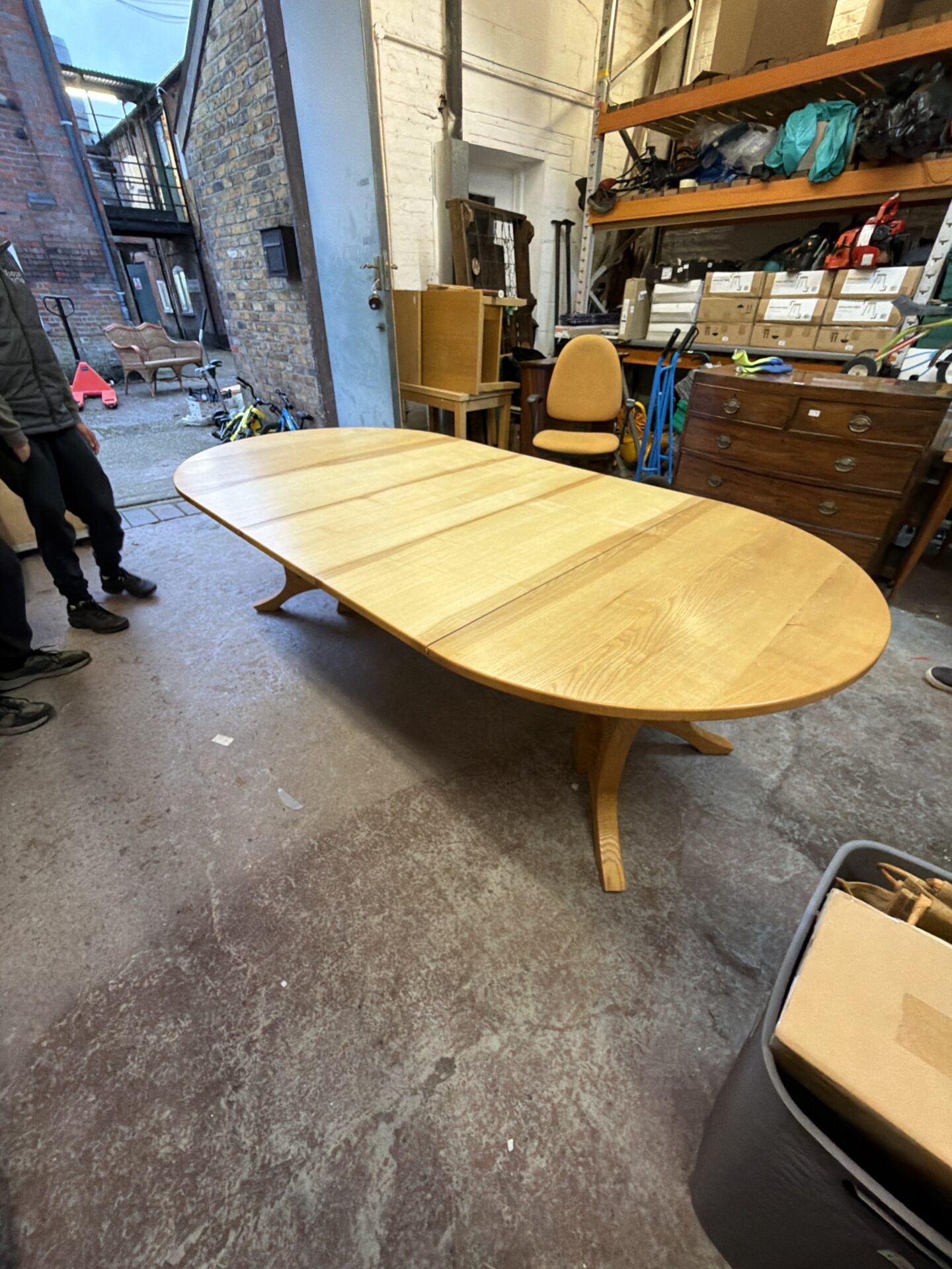 This substantial dining table features a classic oak construction, designed to accommodate gatherings of all sizes. The table’s extendable design allows it to transition from a more intimate setting to a larger dining space, offering versatility for everyday use and special occasions. The warm tones of the oak and the robust build quality suggest a piece intended for longevity and regular use.