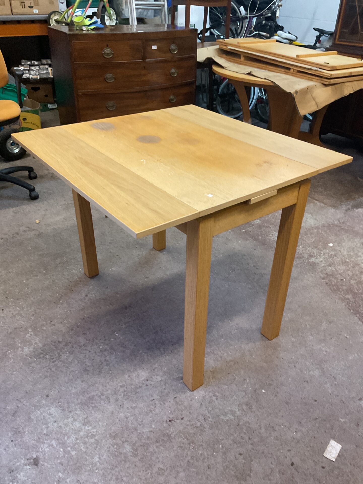 This is a solid wood extending dining table, ideal for flexible dining arrangements. The table features a simple, farmhouse style, constructed from wood, and designed to accommodate varying numbers of guests. Its robust construction suggests it was intended for regular use and offers a practical solution for both everyday meals and larger gatherings.
