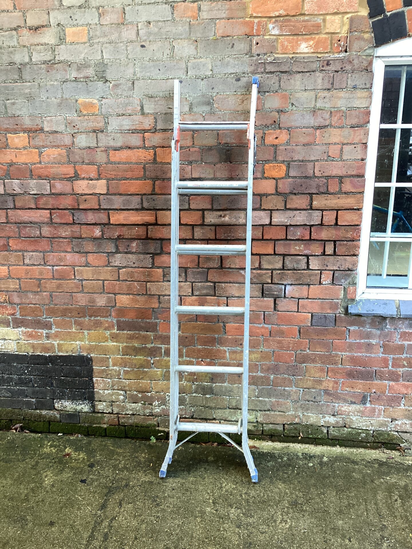This is an Abru extension ladder, constructed from aluminium. It features multiple rungs designed for reaching elevated areas. The ladder is lightweight yet appears robust, suggesting it was intended for regular use.