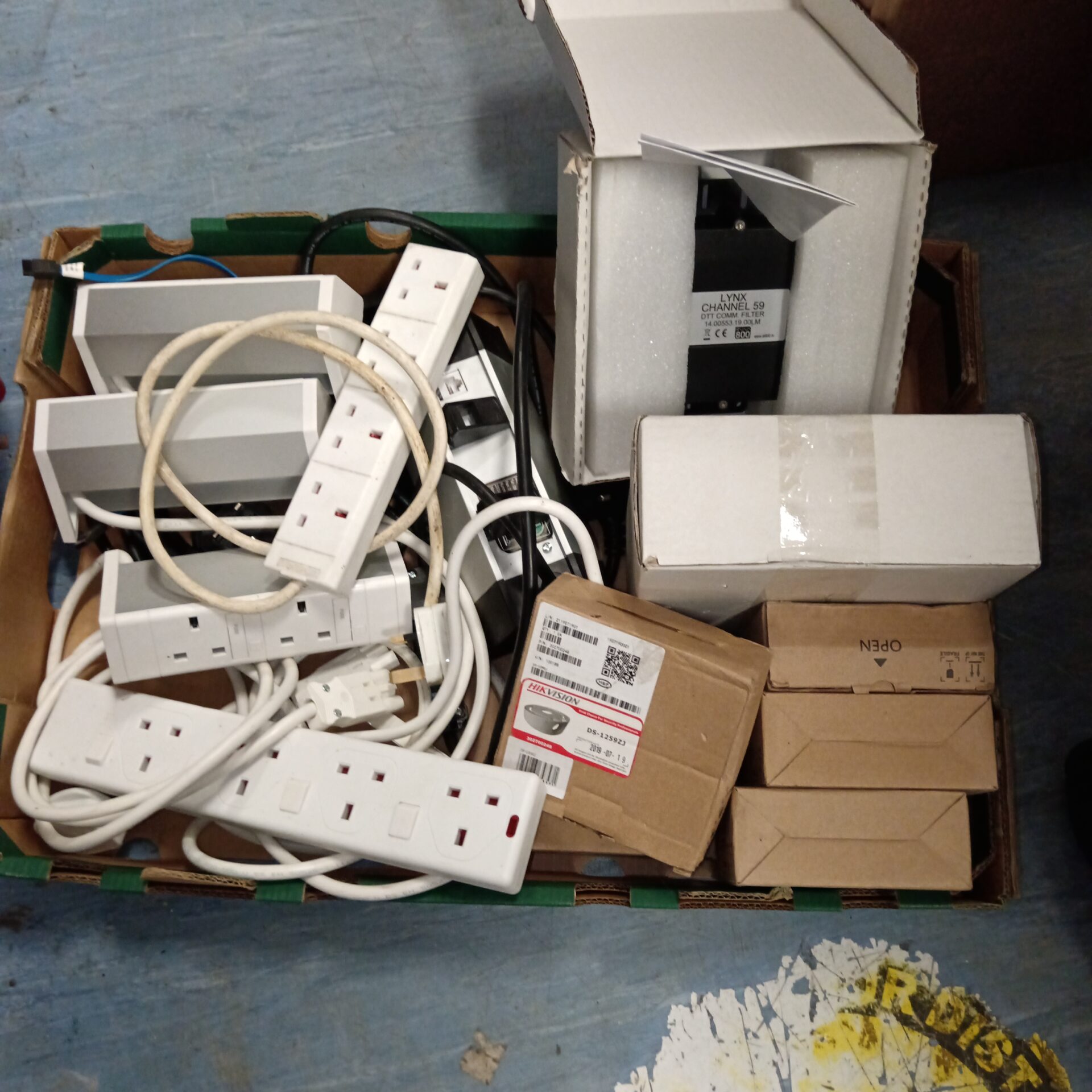 This lot comprises a collection of extension leads and a digital terrestrial television (DTT) signal filter. The extension leads appear to be standard UK three-pin plug sockets, offering multiple outlets for powering various electrical devices. The DTT filter is designed to improve signal reception for digital television broadcasts.