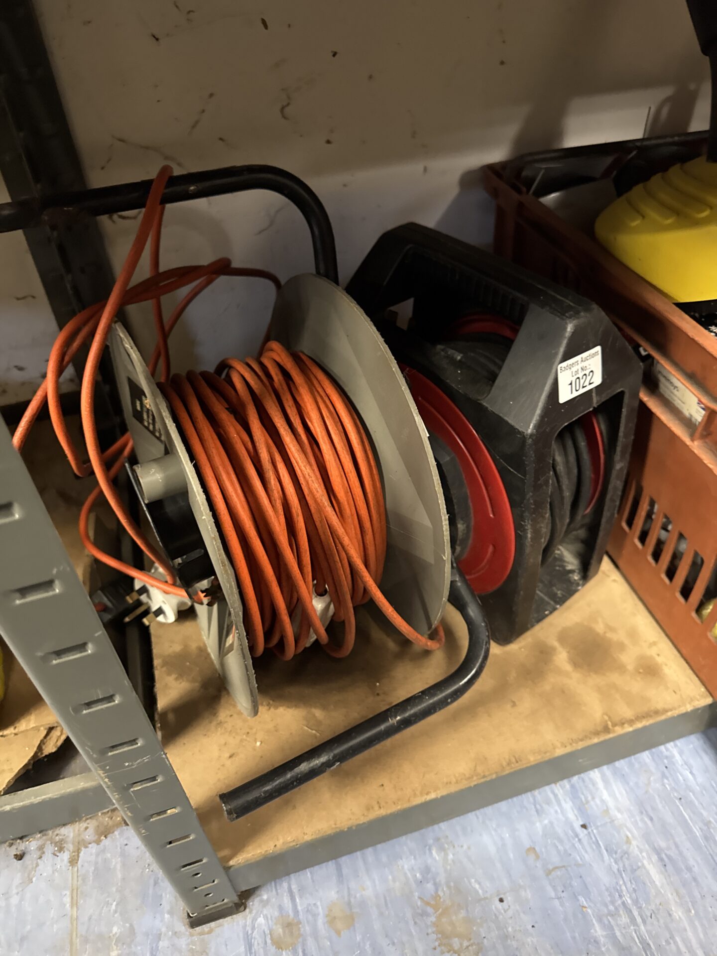 This extension reel shows signs of use and wear, consistent with its age and intended purpose. The plastic casing exhibits some scuffs and marks, but the winding mechanism appears to be intact. This reel may appeal to collectors of vintage tools or those seeking a functional and reliable cable management solution for outdoor or workshop use.