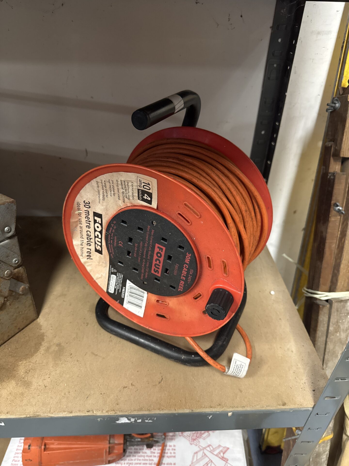 This extension reel is presented for consideration by a buyer who will assess its suitability for their needs. It shows signs of previous use and storage, and its operational status is not confirmed. This reel may appeal to collectors of vintage tools or those seeking a functional item for restoration or repurposing.