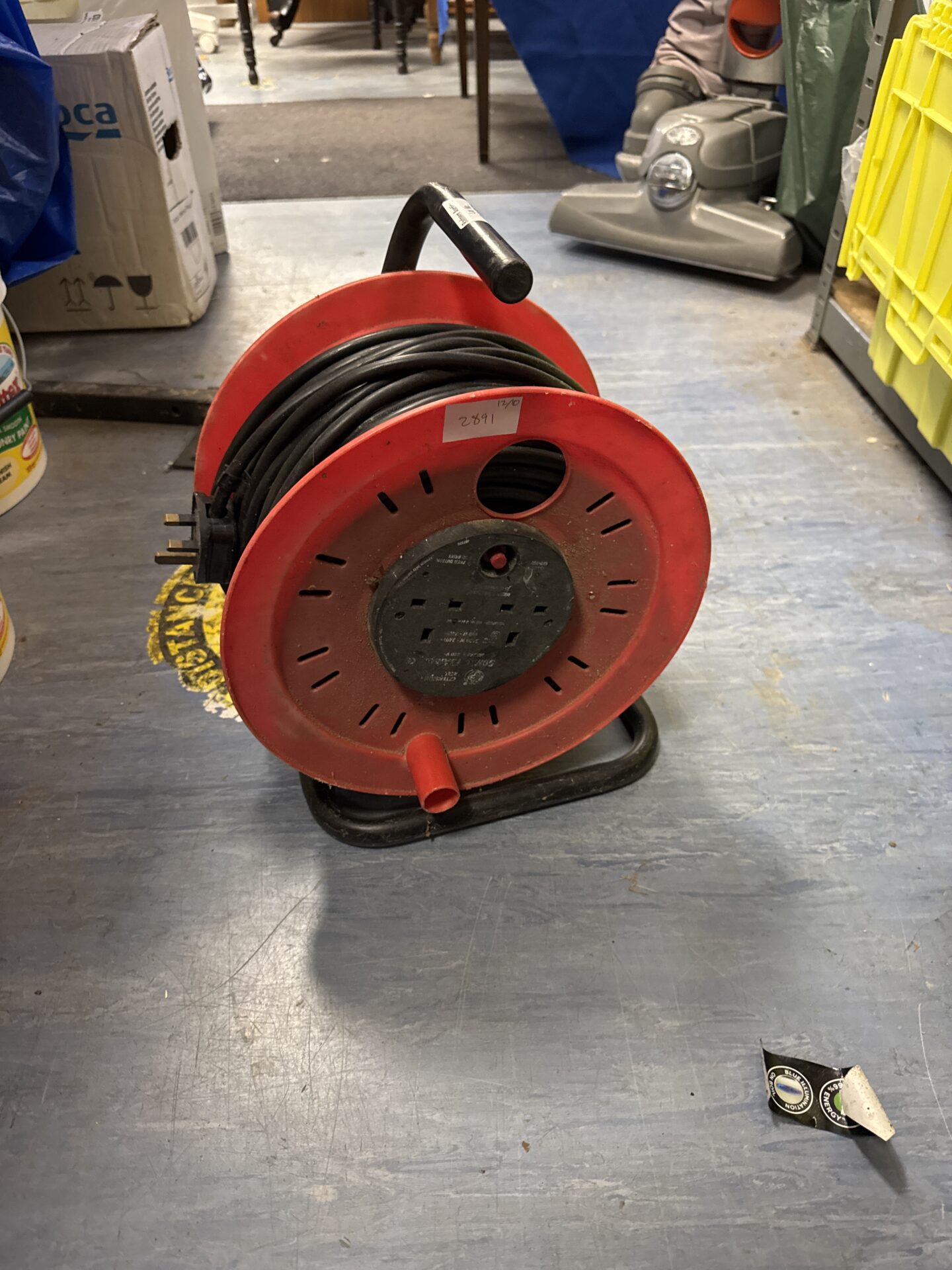 This extension reel appears to be in good working order, showing signs of previous use but remaining fully functional. While not a rare collectible, it represents a functional piece of vintage workshop or garden equipment. It would be ideal for a hobbyist, DIY enthusiast, or someone looking for a reliable extension solution for outdoor or indoor use.