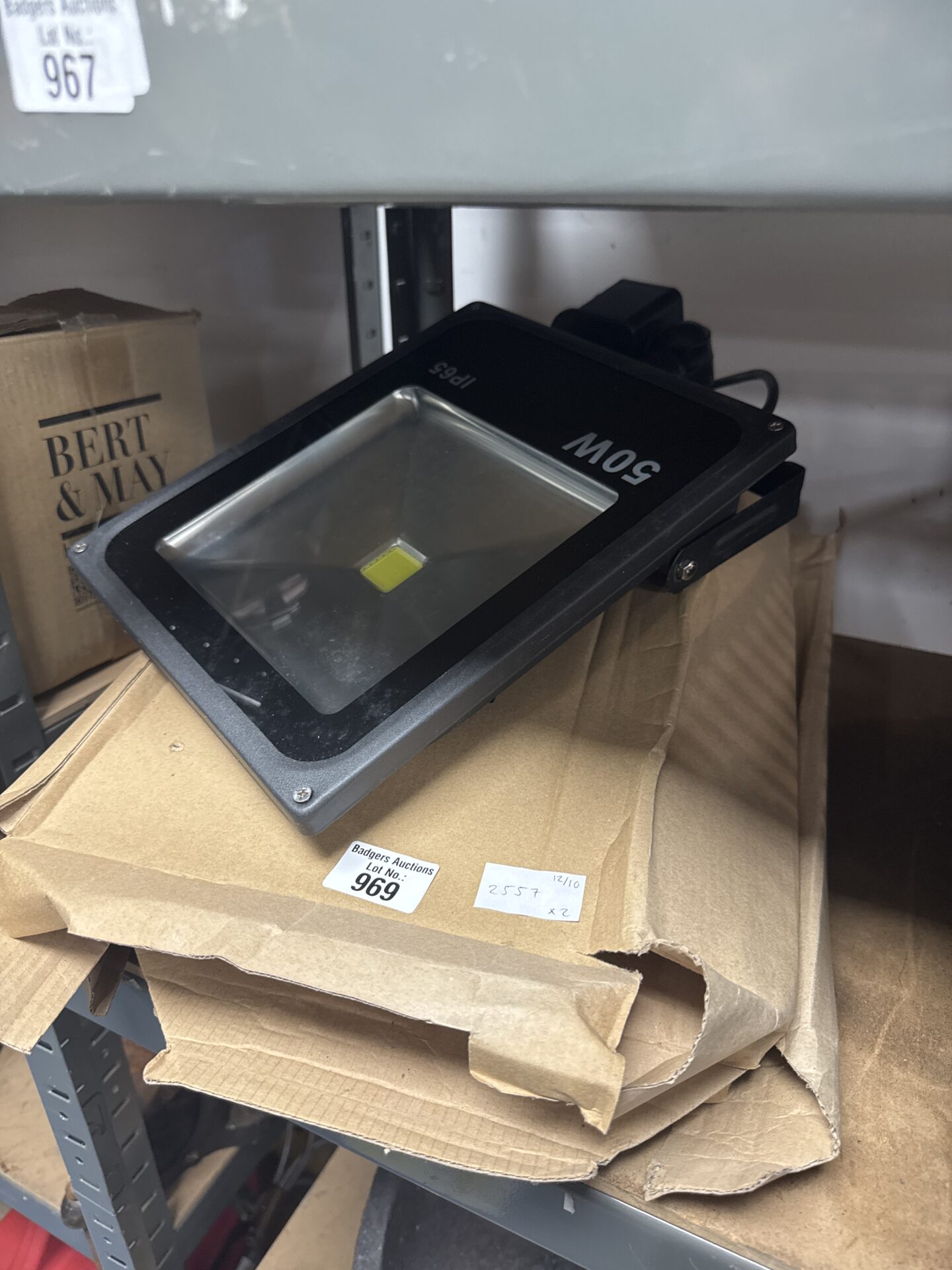 This lot comprises a pair of robust, IP65 rated 50W exterior floodlights. These lights are designed for outdoor use, providing bright illumination for gardens, driveways, or other exterior spaces. Their durable construction and weatherproof rating ensure reliable performance in various conditions.