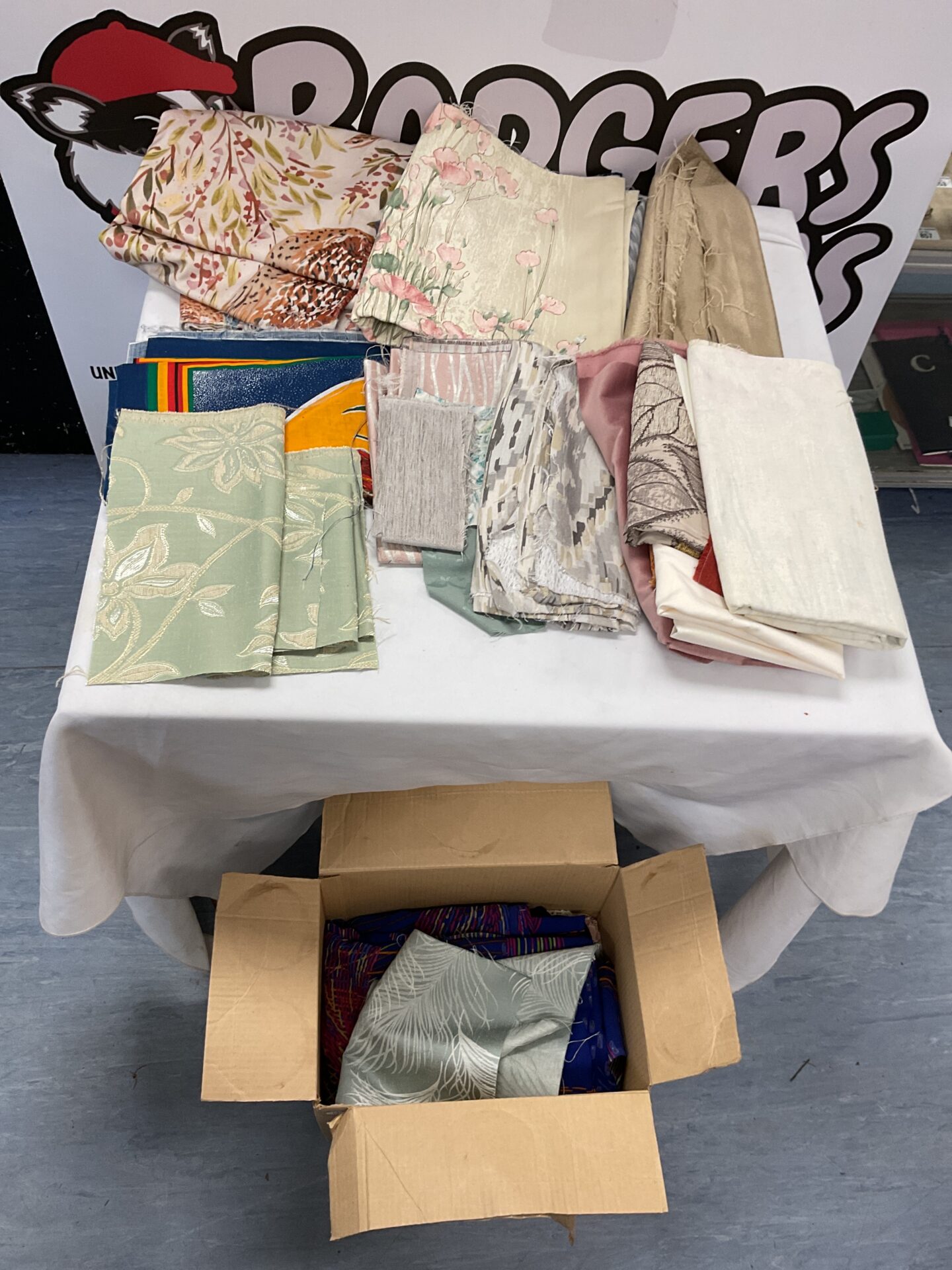 This lot comprises a collection of fabric offcuts, ideal for various craft projects. The fabrics appear to be a mix of materials and patterns, offering versatility for patchwork, quilting, or smaller sewing endeavours. The assortment includes a range of colours and textures, providing creative options for designers and hobbyists.