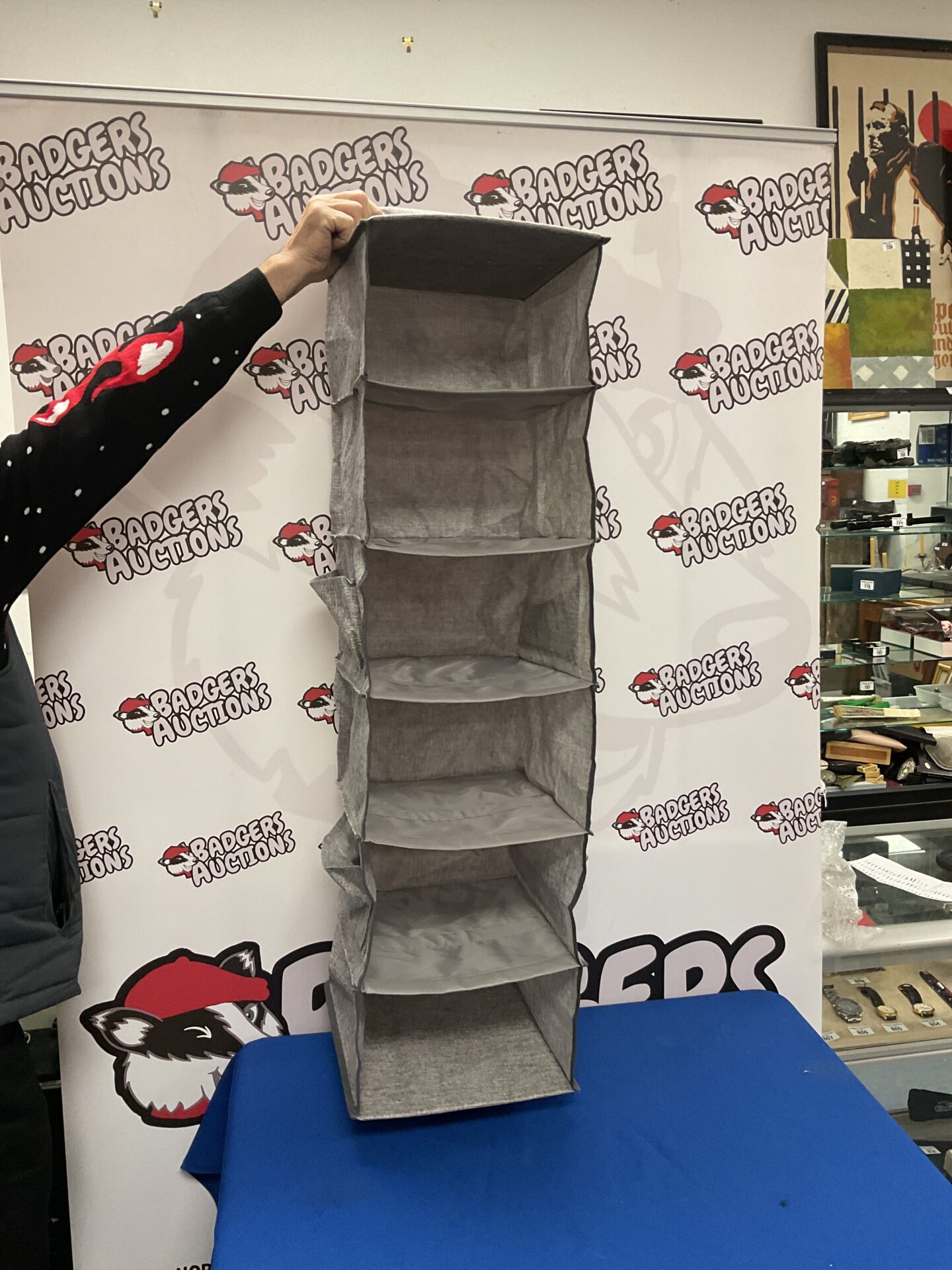 This is a fabric wardrobe organiser, designed to provide additional storage space within a closet or bedroom. Constructed from a grey fabric material, it features multiple compartments for storing clothing, accessories, or other personal items. The collapsible design allows for easy storage when not in use, making it a versatile solution for maximising space.