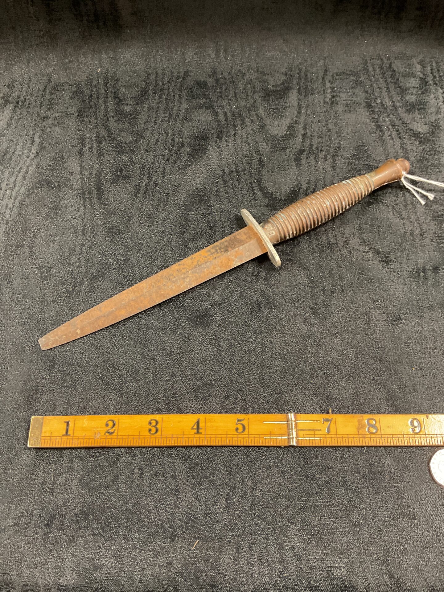 This dagger shows signs of age and use, consistent with its military history. The blade exhibits significant wear and the tip is broken, indicating potential field use or damage. Despite this damage, the dagger remains a desirable piece for collectors of military edged weapons, particularly those interested in WWII British Commando equipment. The textured grip is intact, and the overall construction appears solid, making it a fascinating example of a historically significant fighting knife.