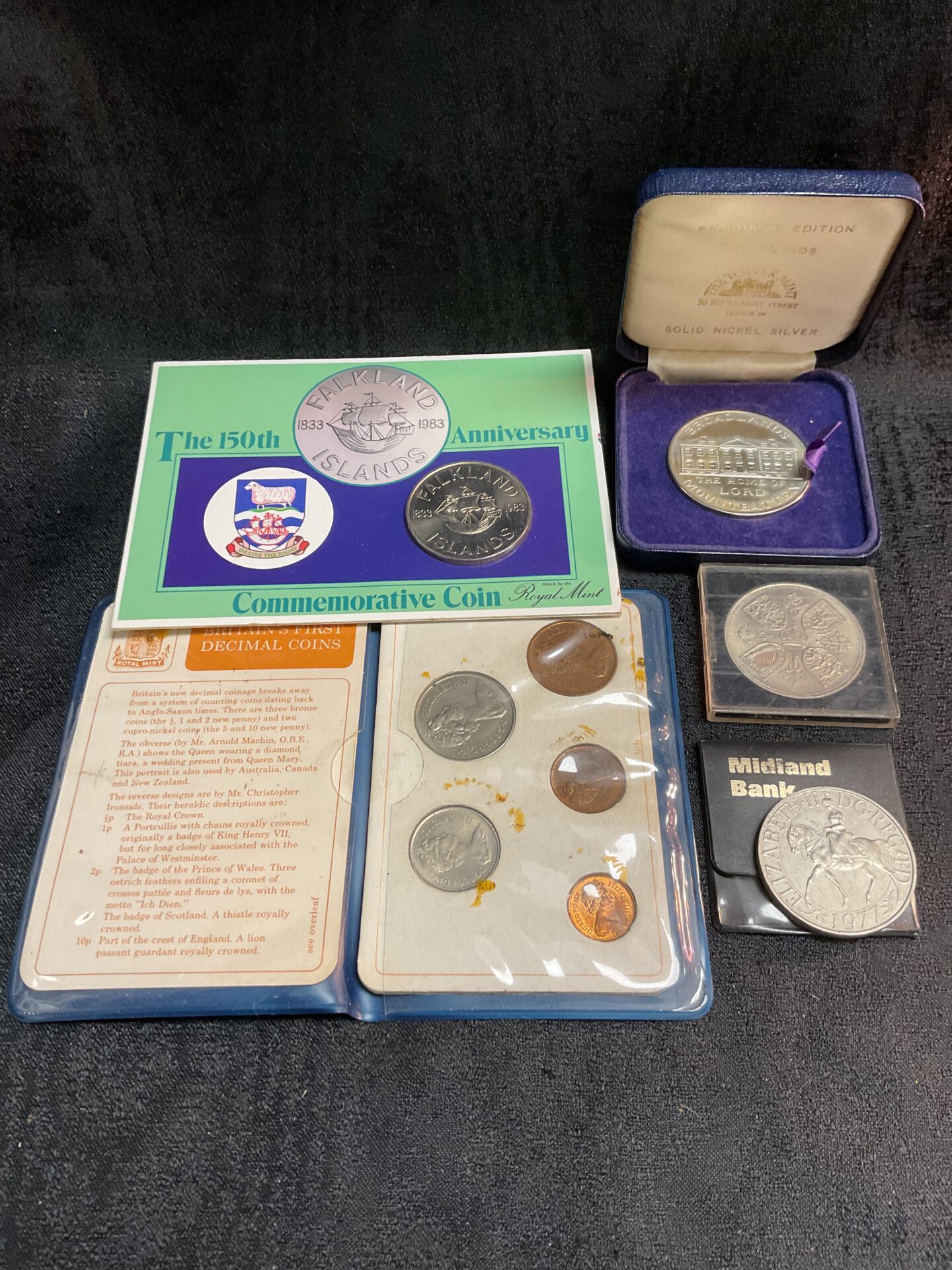 The coins present varying degrees of wear consistent with age and handling. While a detailed assessment of individual coin grades is not provided, the collection as a whole appears to be in acceptable condition for a collector. This lot would be of interest to collectors of British or Falkland Islands coinage, or those interested in commemorative coins and their historical significance.