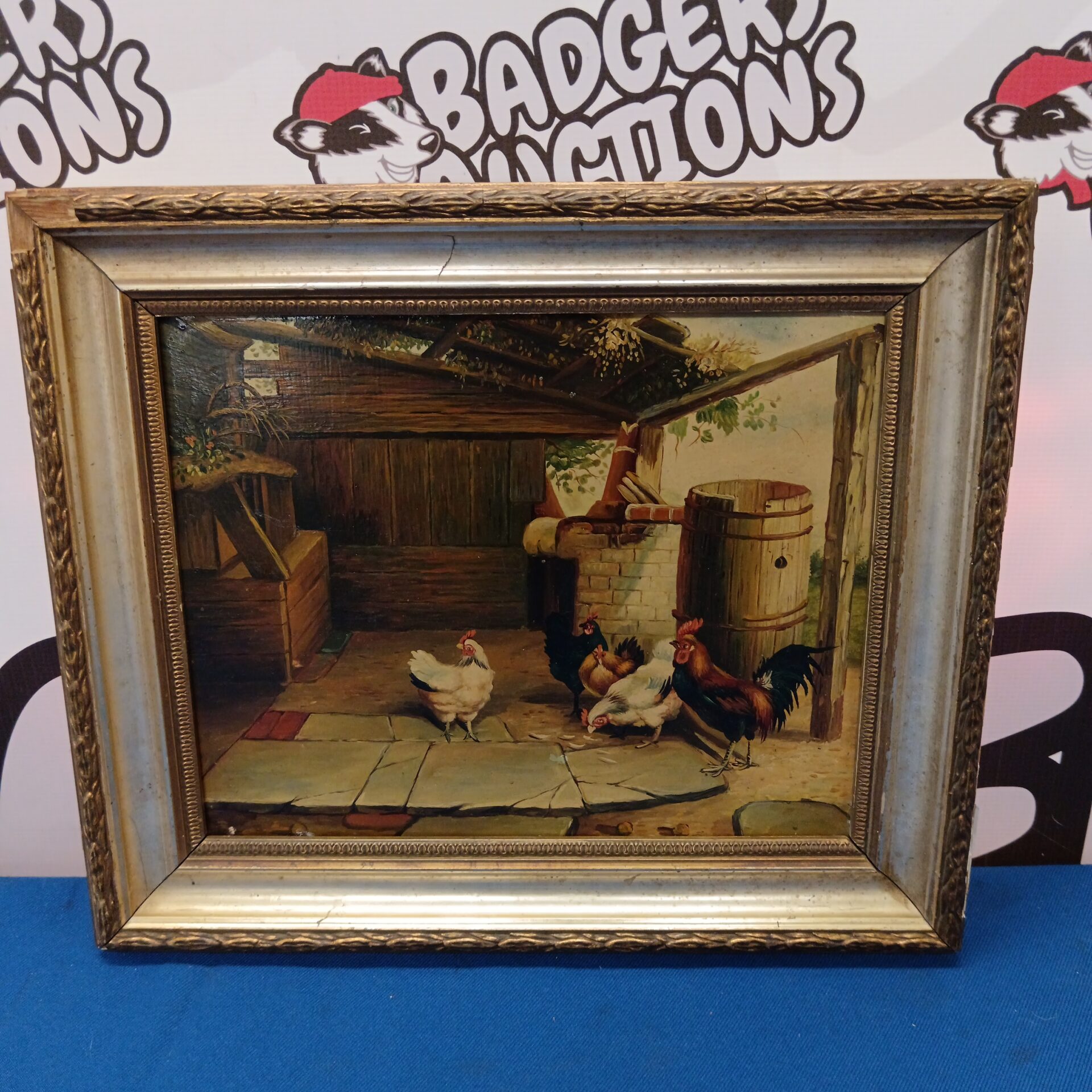 This is an oil painting on panel depicting a vibrant farmyard scene. The artwork features a proud cockerel surrounded by hens, set against a backdrop of rustic farm buildings and a weathered wooden fence. The artist has captured the textures of the animals’ feathers and the rough surfaces of the farmyard with skillful brushwork, creating a charming and evocative rural scene.