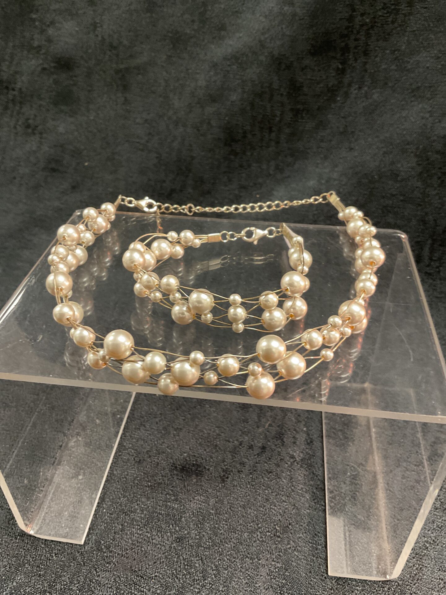 This elegant set comprises a necklace and matching bracelet, both crafted with a silver tone metal and featuring imitation pearls. The design showcases a delicate arrangement of pearls, creating a classic and versatile look suitable for various occasions. The use of 925 silver suggests a quality base metal, enhancing the set’s durability and appeal.