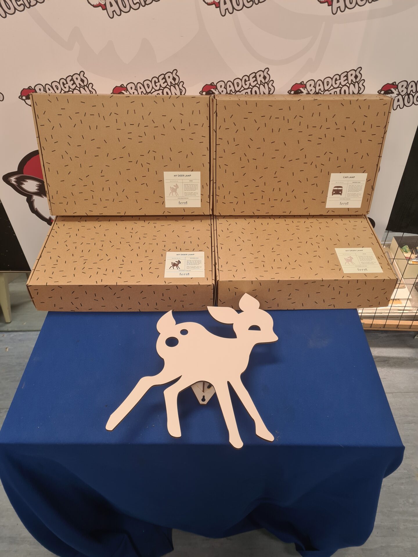 This lot comprises four vintage Ferm wooden lamps, each uniquely shaped as either a deer or a car. Crafted from wood, these lamps exhibit a charming mid-century modern aesthetic. The lamps are designed to be wired for illumination, offering a nostalgic touch to any room.