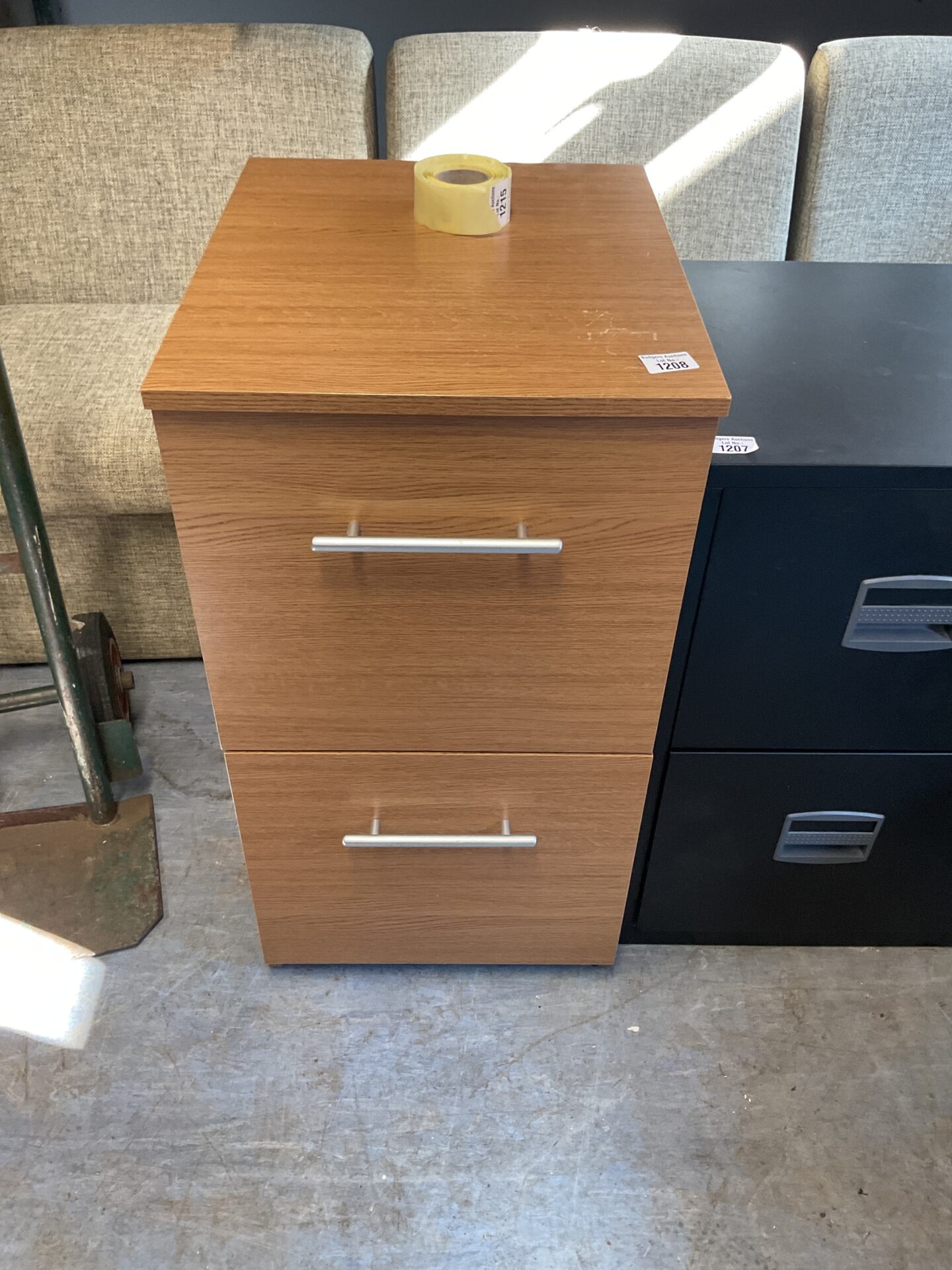 This is a two-drawer filing cabinet, designed for efficient office storage. Constructed from metal, it offers a durable and practical solution for organising documents and paperwork. Its compact size makes it suitable for both home and office environments, providing easy access to essential files.